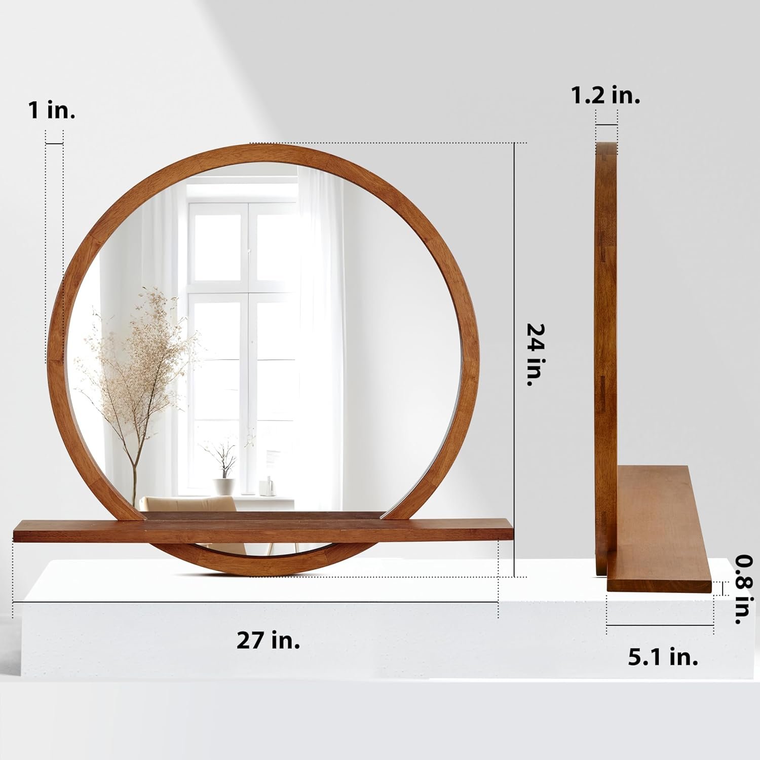 Perfectly Sized – Mirror diameter: 24″ (61 cm); frame width: 1″ (2.5 cm); frame depth: 1.2″ (3 cm). Shelf length: 27″ (68.6 cm); shelf depth: 5.1″ (13 cm); shelf thickness: 0.8″ (2 cm).