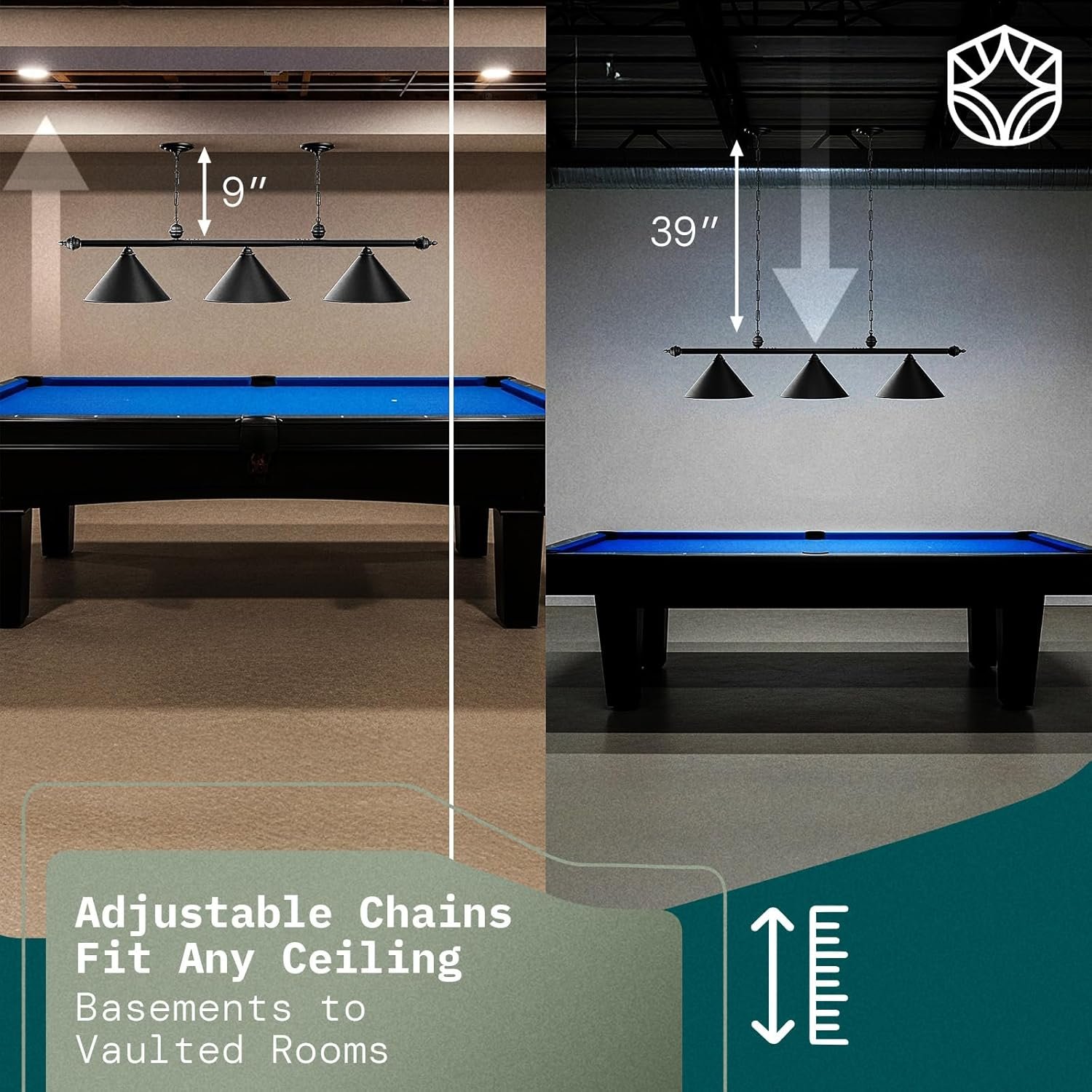 [Durable Height-Adjustable Chains for 8-12ft Ceilings] Includes 3 reinforced steel chains (adjustable 9”-39”) to fit vaulted, sloped, or low ceilings—perfect for attics, basements, game rooms, or bars.
