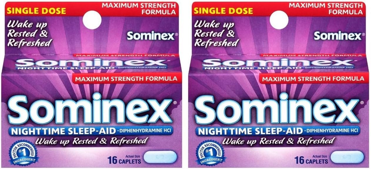 Sominex Nighttime Sleep-Aid Caplets, Maximum Strength, 16 ea (Pack of 2) – Wake up rested and refreshed with Maximum Strength Sominex Nighttime Sleep-Aid. With the #1 doctor-recommended ingredient, Diphenhydramine HCI, this product relieves occasional sleeplessness including difficulty getting to sleep, difficulty staying asleep, and changes in your routine like jet lag. Directions: Adults and children 12 years and older: Take 1 caplet at bedtime if needed, or as directed by a doctor. For best results, take the recommended dose. This will provide approximately 6 to 8 hours of restful sleep. Warnings: Tamper Evident: This product is protected in a sealed blister. Do not use if a blister or printed foil is broken.