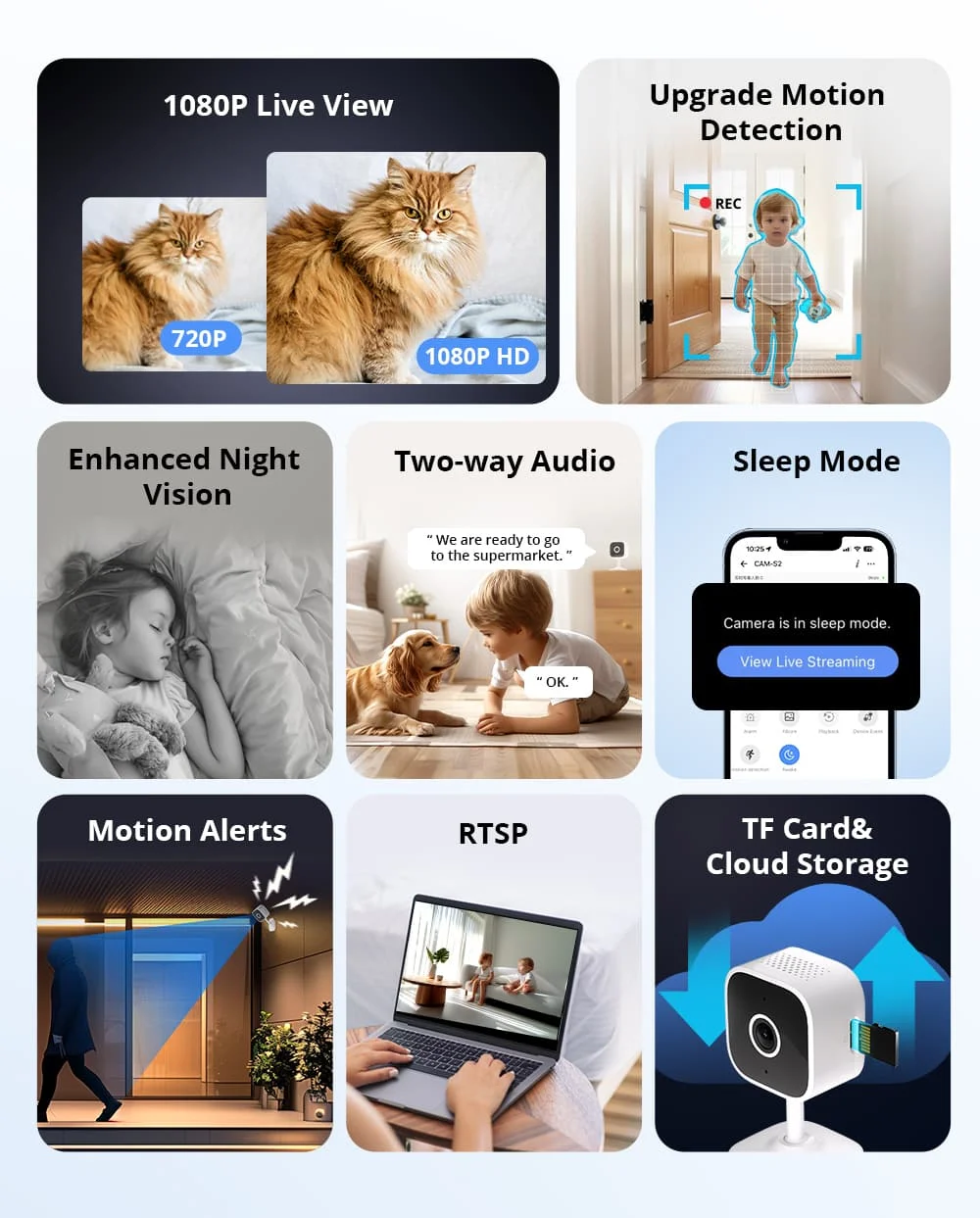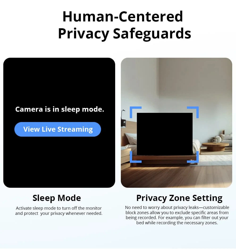 【1080P Live View】Experience stunning clarity with 1080P Full HD resolution, ensuring every detail is vividly clear for optimal viewing pleasure.【Customize Alert Zones】Tailor your security experience by defining specific zones of interest within the camera’s field of view. Focus on your alert areas and adjust sensitivity to ensure you’re only alerted to events that are significant to you.【Human Detection】The AI algorithm ensures the camera records and alerts only when the sensor detects a person. This intelligent recognition system reduces unnecessary notifications and enhances your ability to respond promptly to real threats.【Privacy Safeguards】You can activate sleep mode to turn off the monitor and protect your privacy; Customizable privacy zones allow you to exclude specific areas from being recorded. No need to worry about privacy leaks.【Local & Cloud Storage】You can choose to save videos with cloud storage through the Camera Plan (sold separately) or save them locally using a TF card (sold separately).