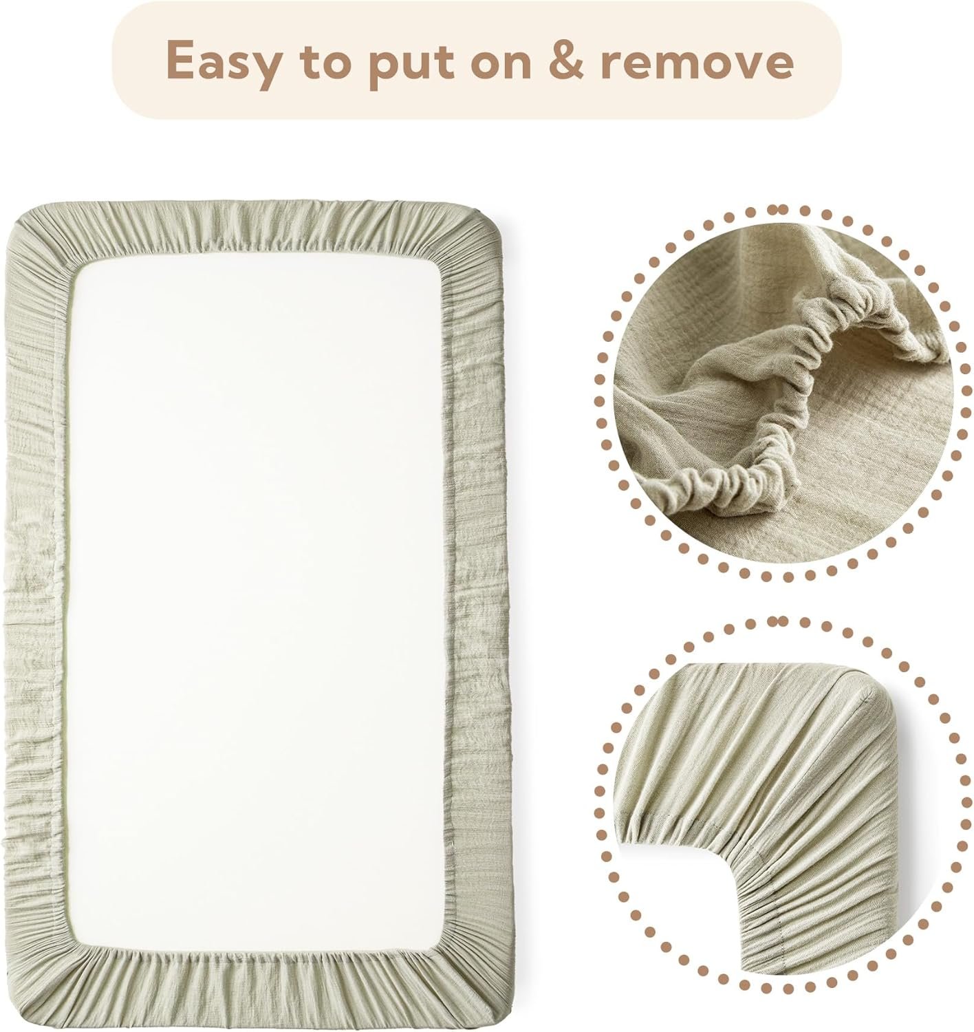 Easy to Care: Machine or hand wash Cold, Gentle cycle, Wash separately, Don’t bleach, and Tumble dry low. The fitted muslin crib sheet will not fade, shrink or pill after washing. It can still keep its softness after many washes and is very durable.