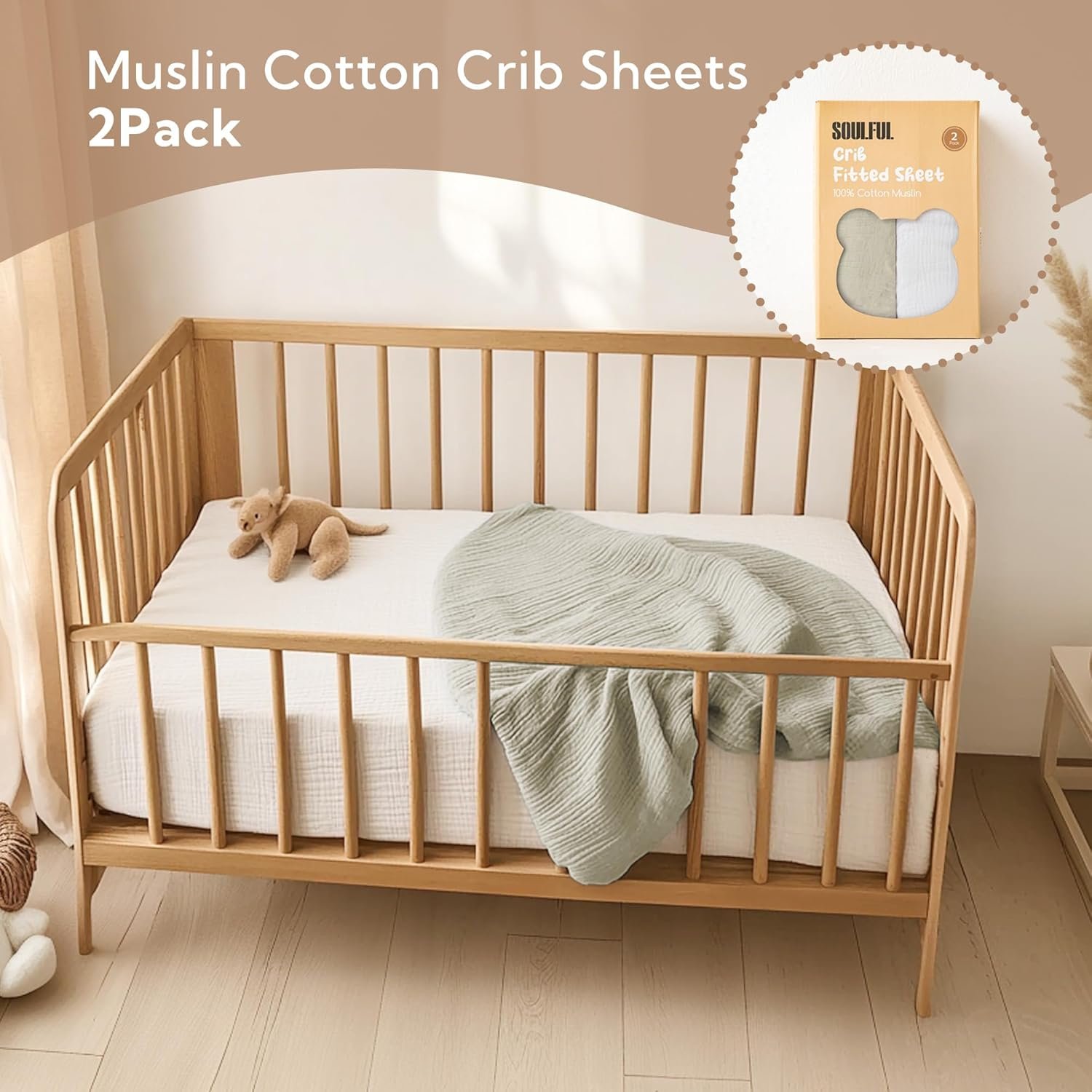 SOULFUL Muslin Crib Sheets for Boys Girls, 2 Pack Soft and Breathable Organic Cotton Fitted Crib Sheets for Standard Crib Mattress (28″x 52″, White & Mist Sage)