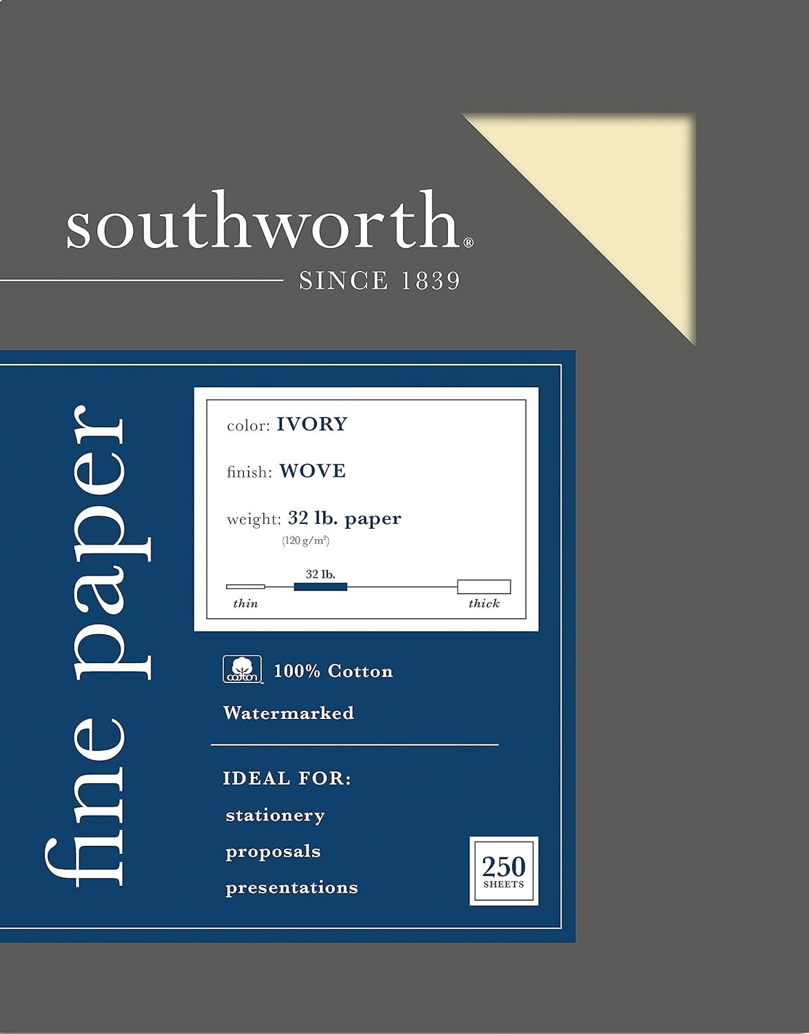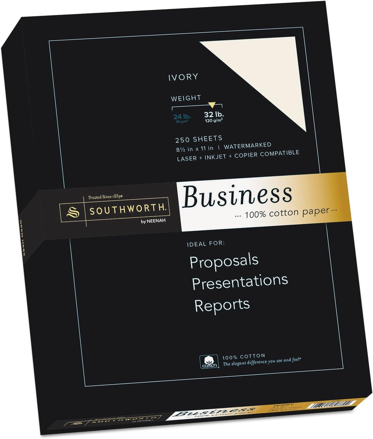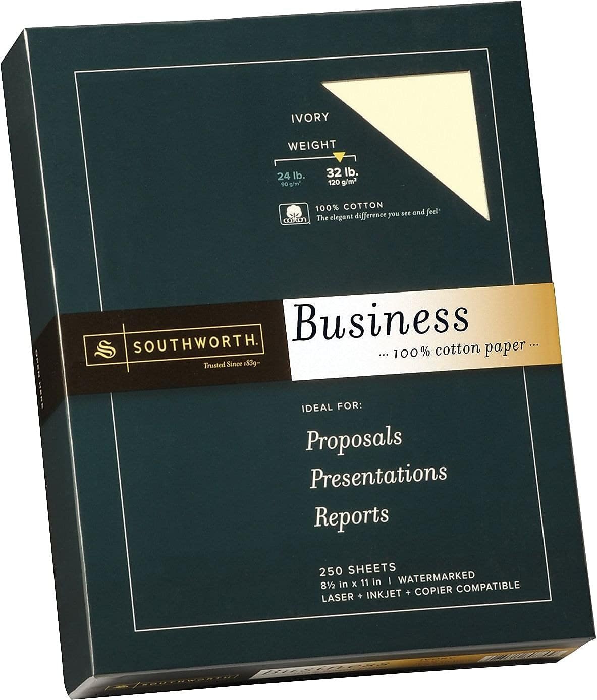 Southworth 100% Cotton Business Paper, 8.5 x 11 Inches, 32lb, Wove finish, Ivory, Watermarked, 250 per Box, Laset, Inket & Copier compatible. Packaging may vary.