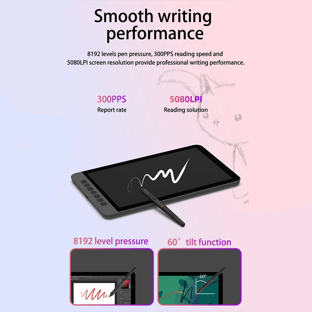 -With 8192 Levels Pen Pressure, it enables accurate ,smooth, neat and natural lines during digital creation. With the battery free technology, no need to charge the pen or replace battery anymore, which is environment-friendly. The silicone covers the hand holding part of the pen, which can get your hands no pain and no discomfort after prolonged creation.