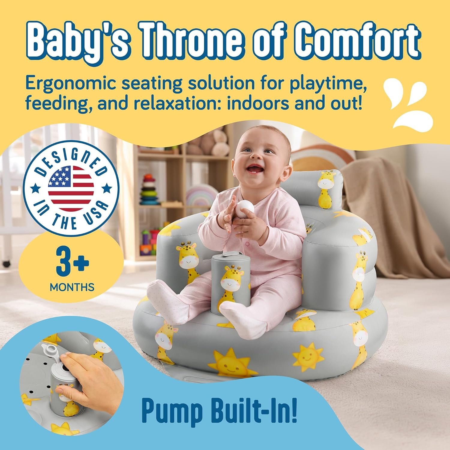 SplashEZ Inflatable Baby Seat – Sit-Up Chair for Kids 3 Months to 3 Years, Blow-Up Baby Seat with Air Pump for Home, Inflatable Sit Me Up Chair for Infant Back Support, Floor & Travel, Giraffes