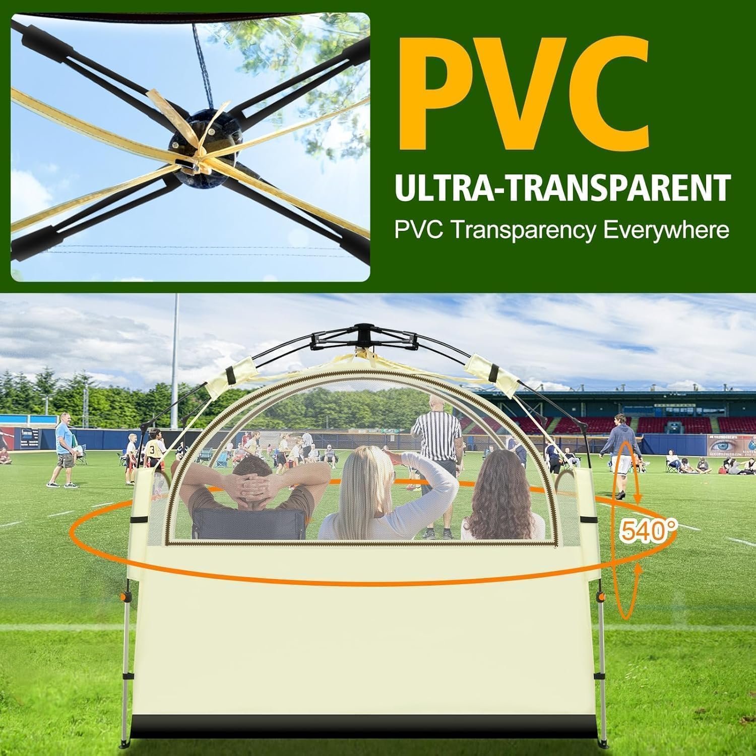 540° Ultra-clear Vision: The transparent bubble tent provides a 540-degree panoramic clear view, the double zipper PVC door allows you to clearly see the surrounding environment or beautiful scenery. Perfect for watching sports events, camping, hiking, fishing, photography, and outdoor movies.