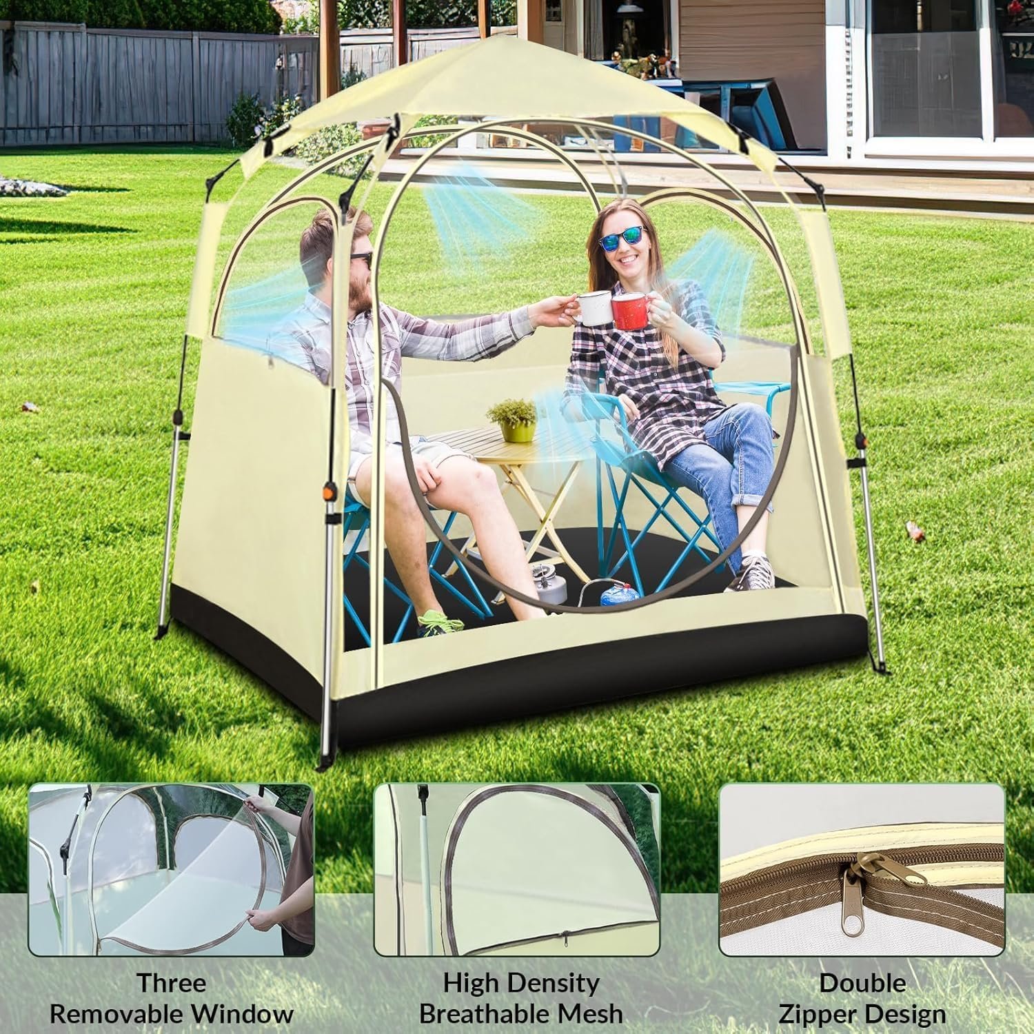 Perfect Design: The bubble tent features four breathable ventilation ports, one door, and three large windows, along with mesh ventilation windows on the back and sides, it provides excellent ventilation and mosquito protection in hot weather. The detachable top cover safeguards you from sun exposure and rain, while the fixed waterproof PE floor keeps the interior and your personal items clean and dry.