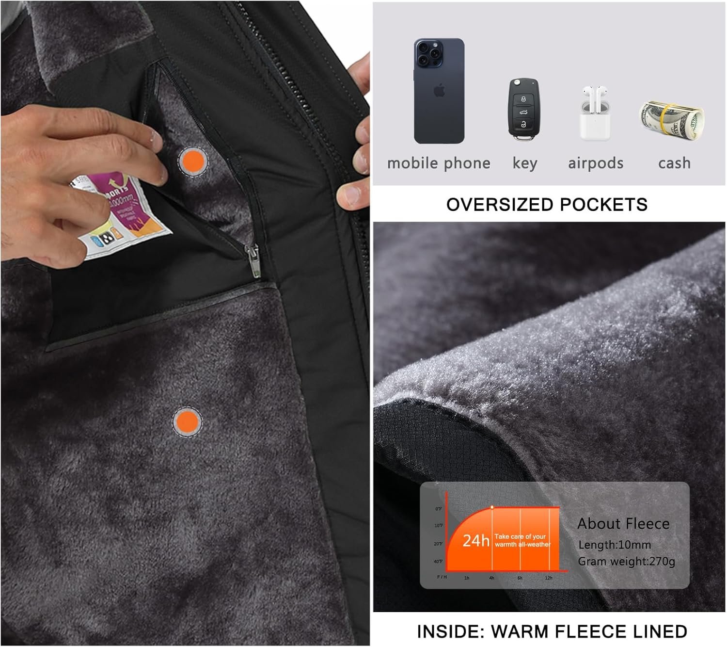 Customers find the jacket perfect for cold weather, with great design, nice fleece lining, and good value for money. The material is durable with perfect thickness, and they appreciate its comfort, with one customer noting the puffy fur-like lining inside. The jacket is waterproof, with one customer mentioning it handled two heavy rains well. While some customers say it fits great, others find it too small, and while there are many zippered pockets, some wish they were bigger.