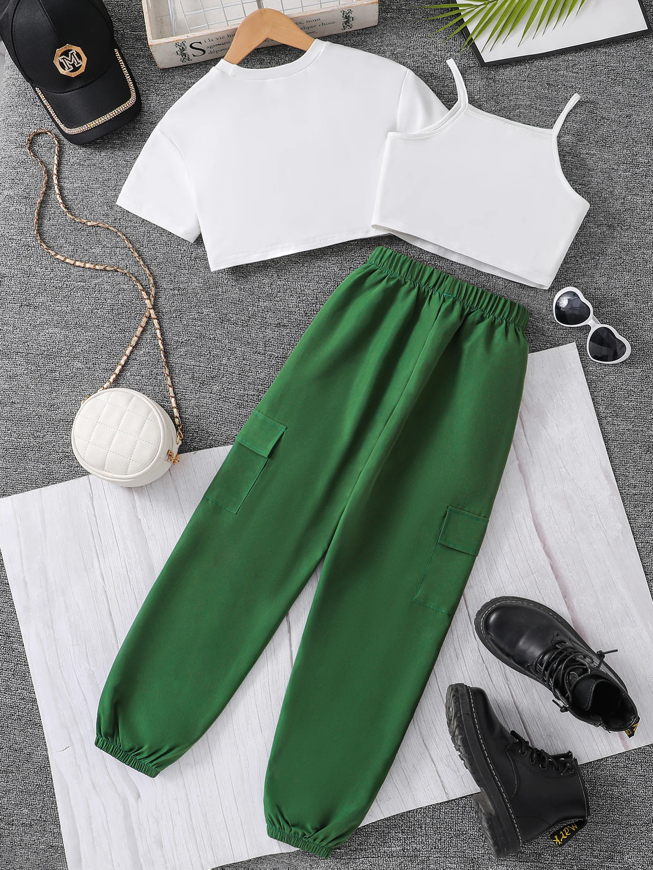 10 reviews for Spring/summer children’s fashion trend Girls Athleisure basic three-piece letter print T-shirt Solid color halter vest sweatpant