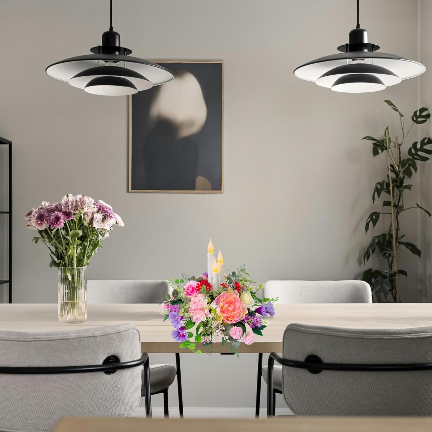 Enhance your home decor with this elegant floral centerpiece, featuring a lifelike mix of peonies, roses, and morning glory. Designed for dining tables, weddings, and special occasions, this artificial floral arrangement adds charm and sophistication to any setting. This battery-powered centerpiece is compatible with taper flameless candles, creating a warm, inviting atmosphere without the hassle of real flames. It runs on 3 AAA batteries (not included), allowing you to place it anywhere without worrying about power cords. Ideal for all-season decor, this versatile centerpiece complements both spring and summer themes while also serving as a stylish decoration for weddings, holiday gatherings, and everyday use. Whether used as a table centerpiece, mantel accent, or wedding decoration, it brings a touch of timeless elegance to your space
