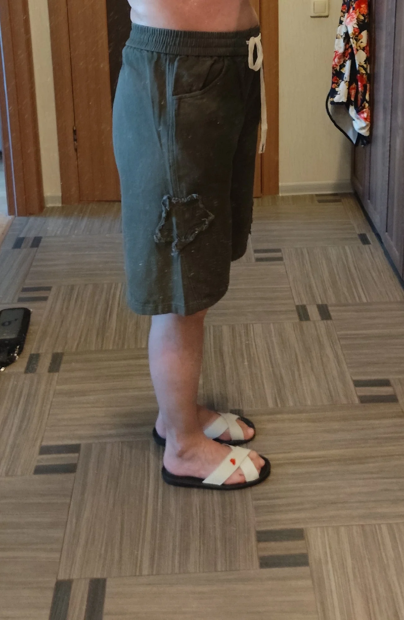 Thick soft fabric, cotton blend. Well stitched, although internal seams are not all perfect. High rise. Normal pockets. The stars are fun, look original… I plan to slightly “fluff” the edges. For my height 174 cm, bust 86 cm, waist 108 cm, weight 76 kg, they fit perfectly. Delivered very quickly. Perfectly packaged. Very satisfied with the order.