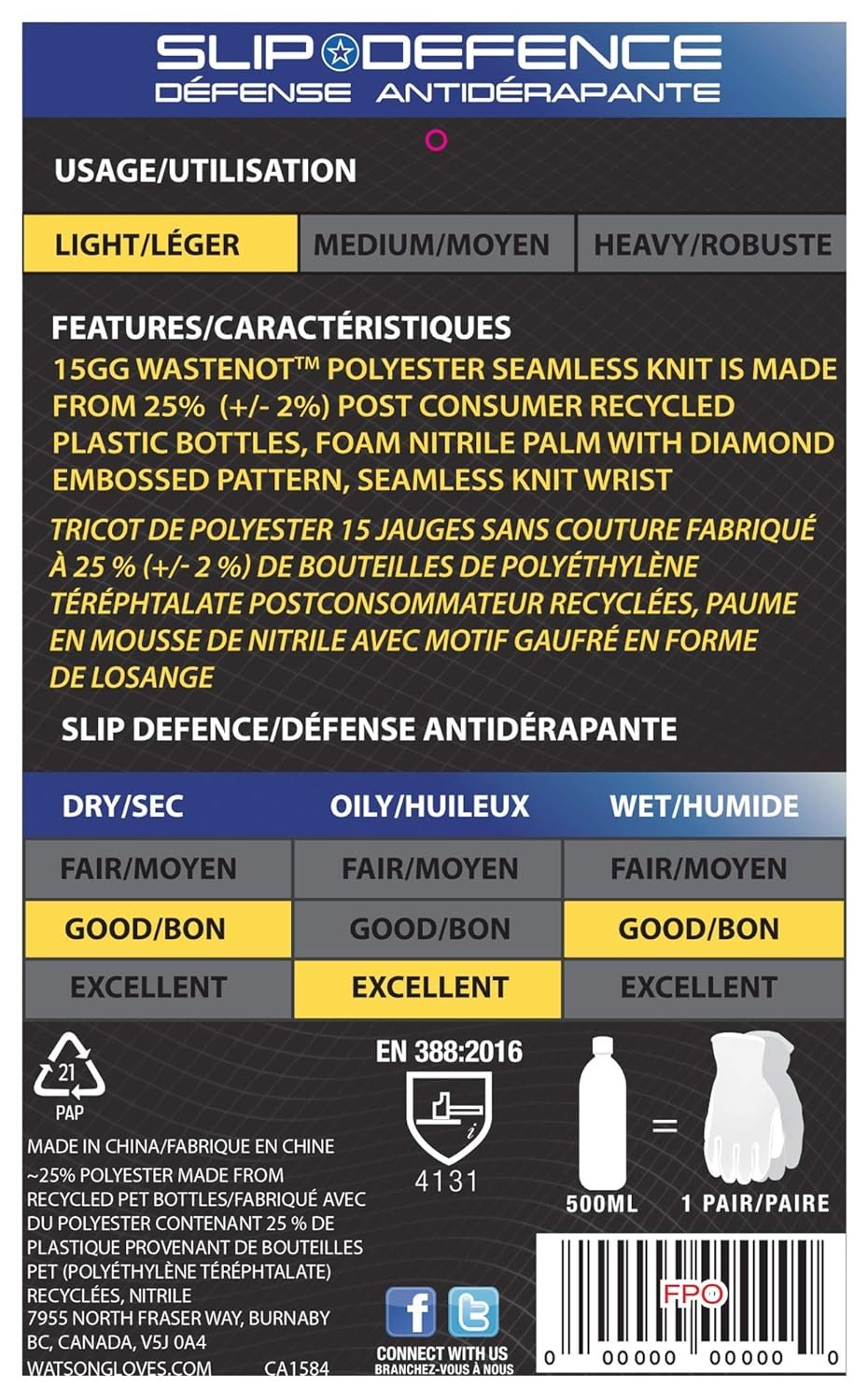 15g WasteNot polyester knit made from 25% (+/- 2%) recycled post consumer PET bottles. One 500mL bottle is used to make 1 pair of gloves