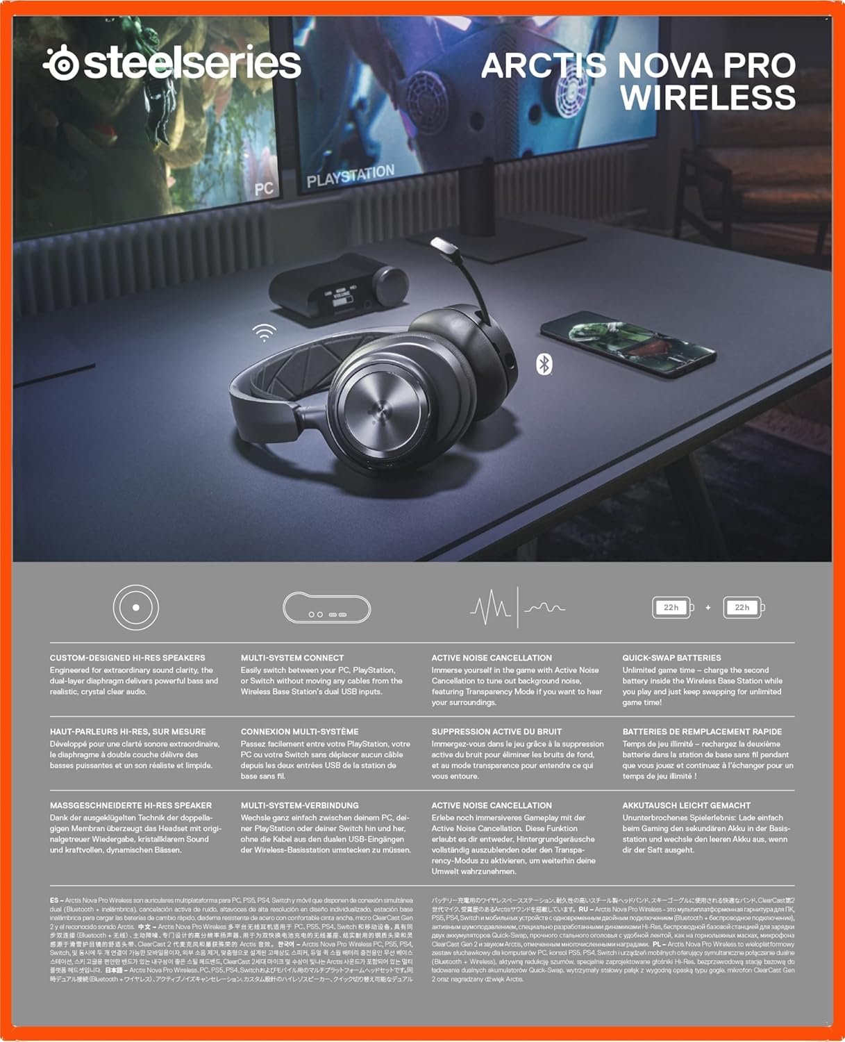 SteelSeries Arctis Nova Pro Wireless Multi-System Gaming Headset – Premium Hi-Fi Drivers – Active Noise Cancellation – Infinity Power System – Stealth Retractable Mic – PC, PS5/PS4, Switch, Mobile