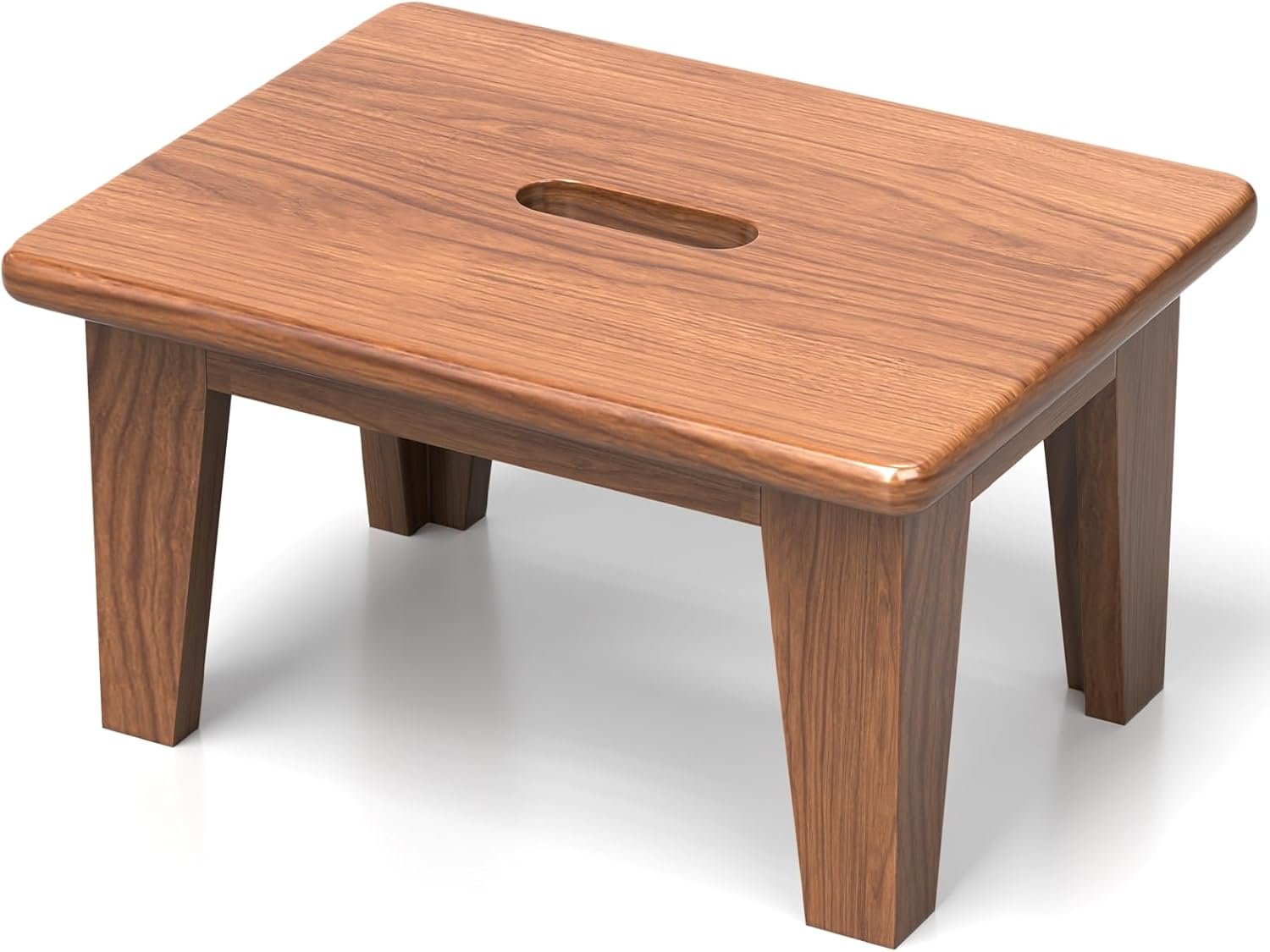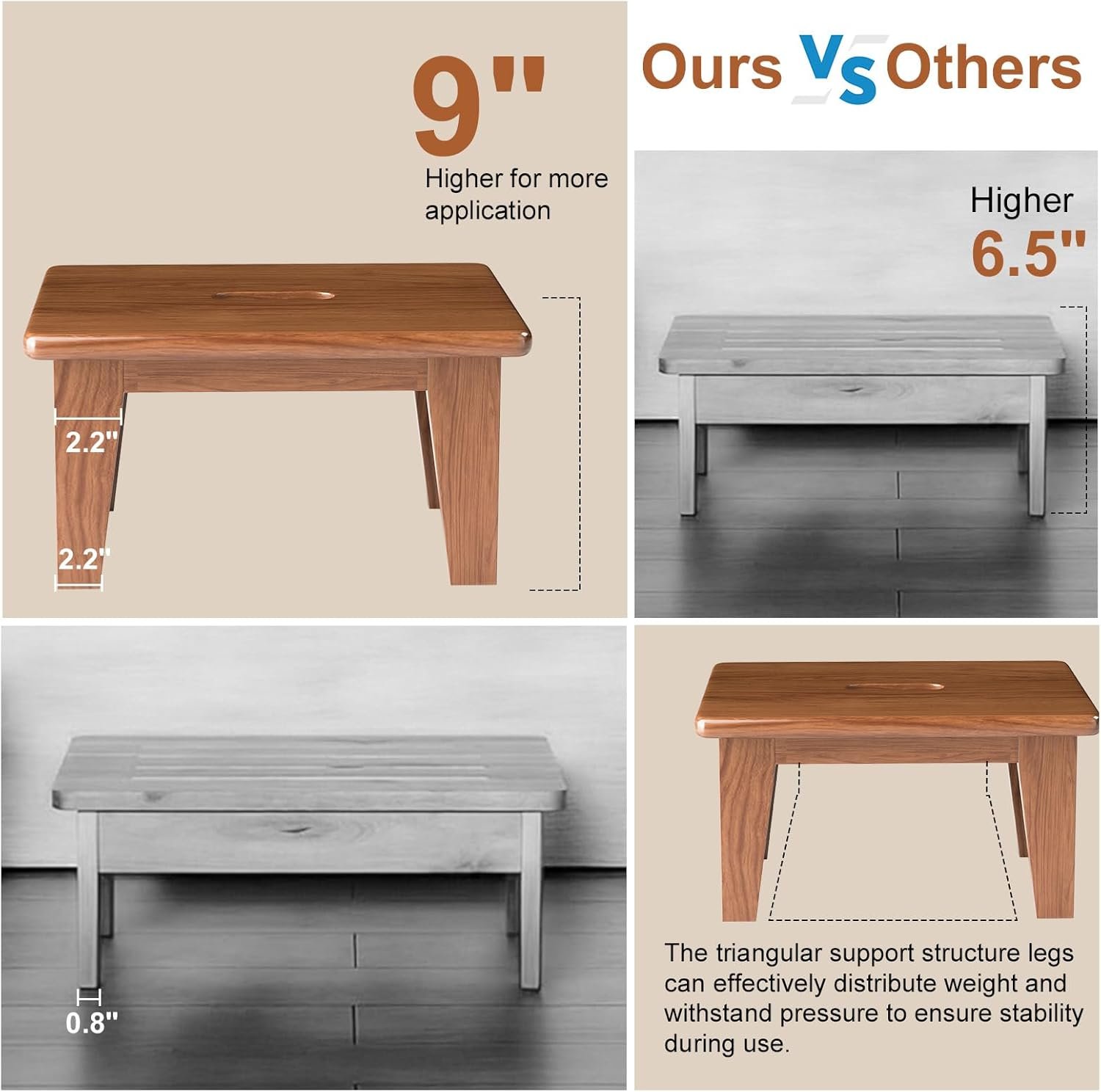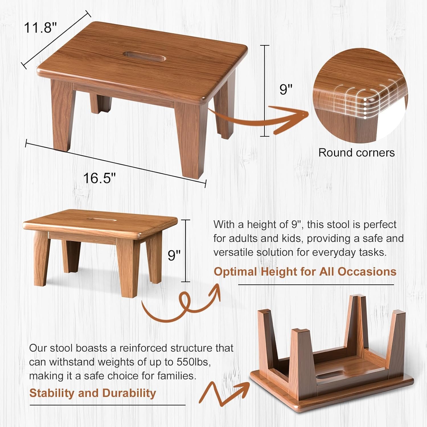 Increase Height up to 9″: elevate your daily tasks with wood foot stool that accommodates adults, children and the elderly. We improve and update the size of market small wooden stool to 16.5”L x 11.8”W x 9”H, which could offer a stable standing support . The bed step stool is rounded corners make it family-friendly.