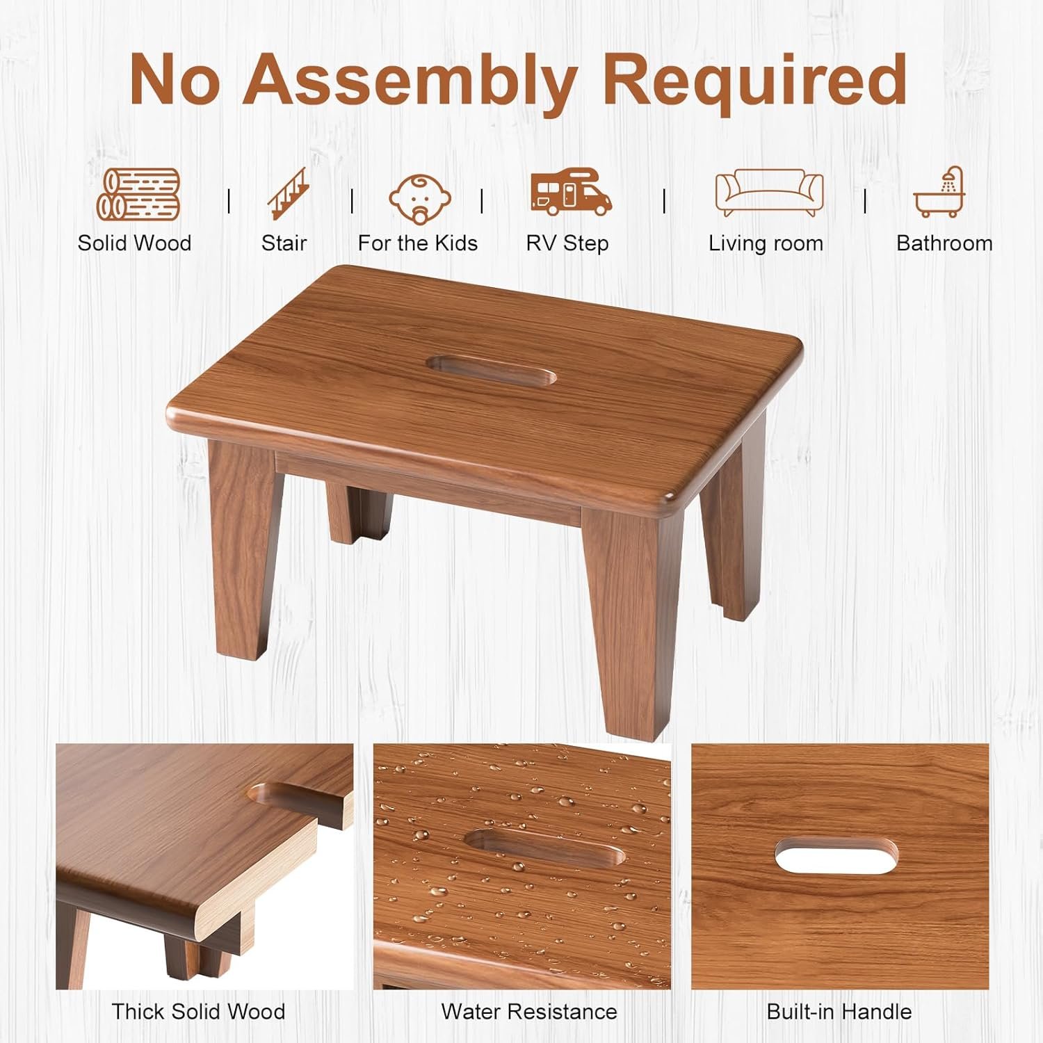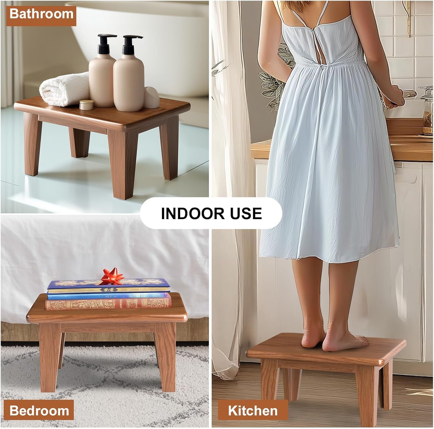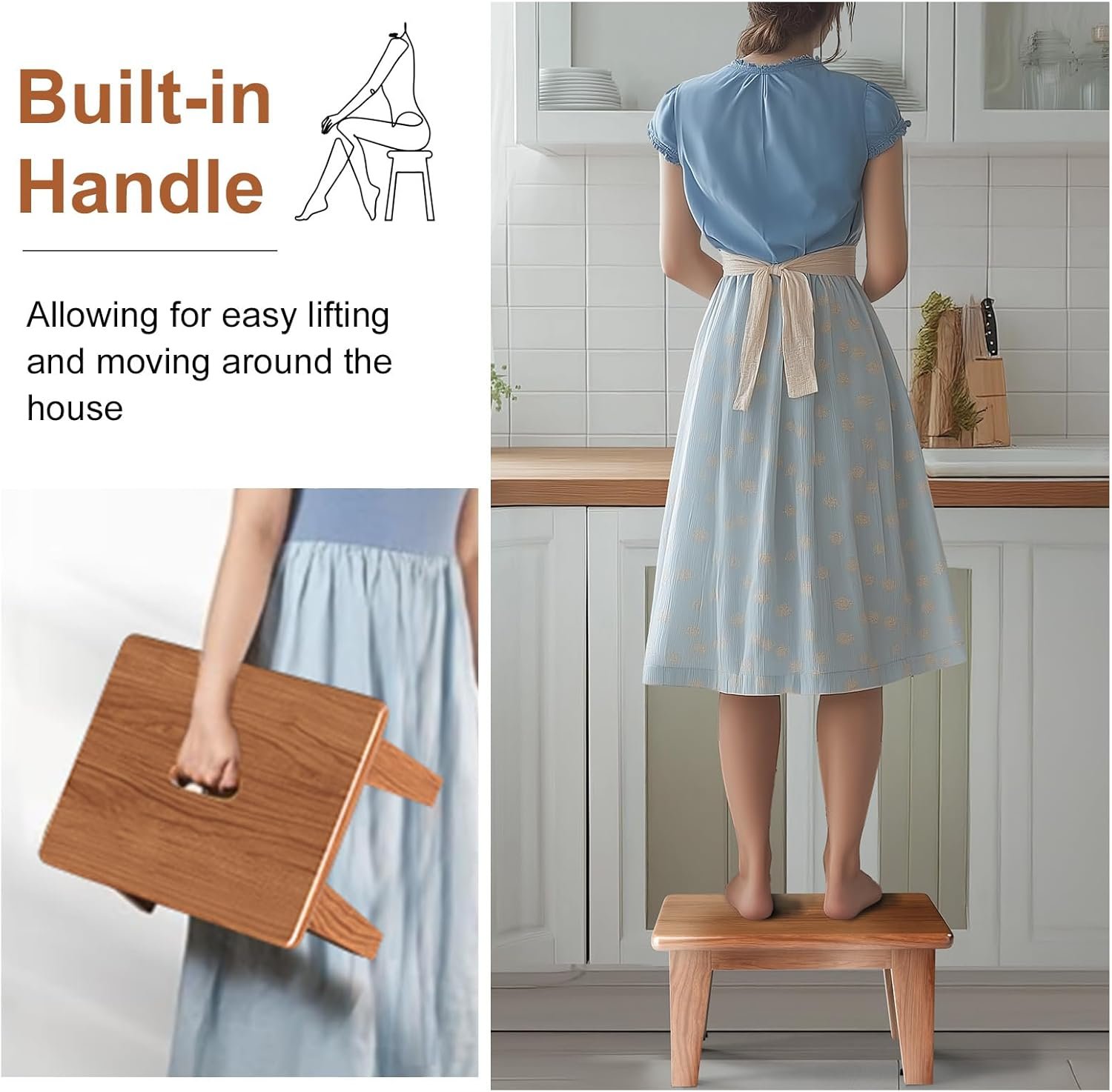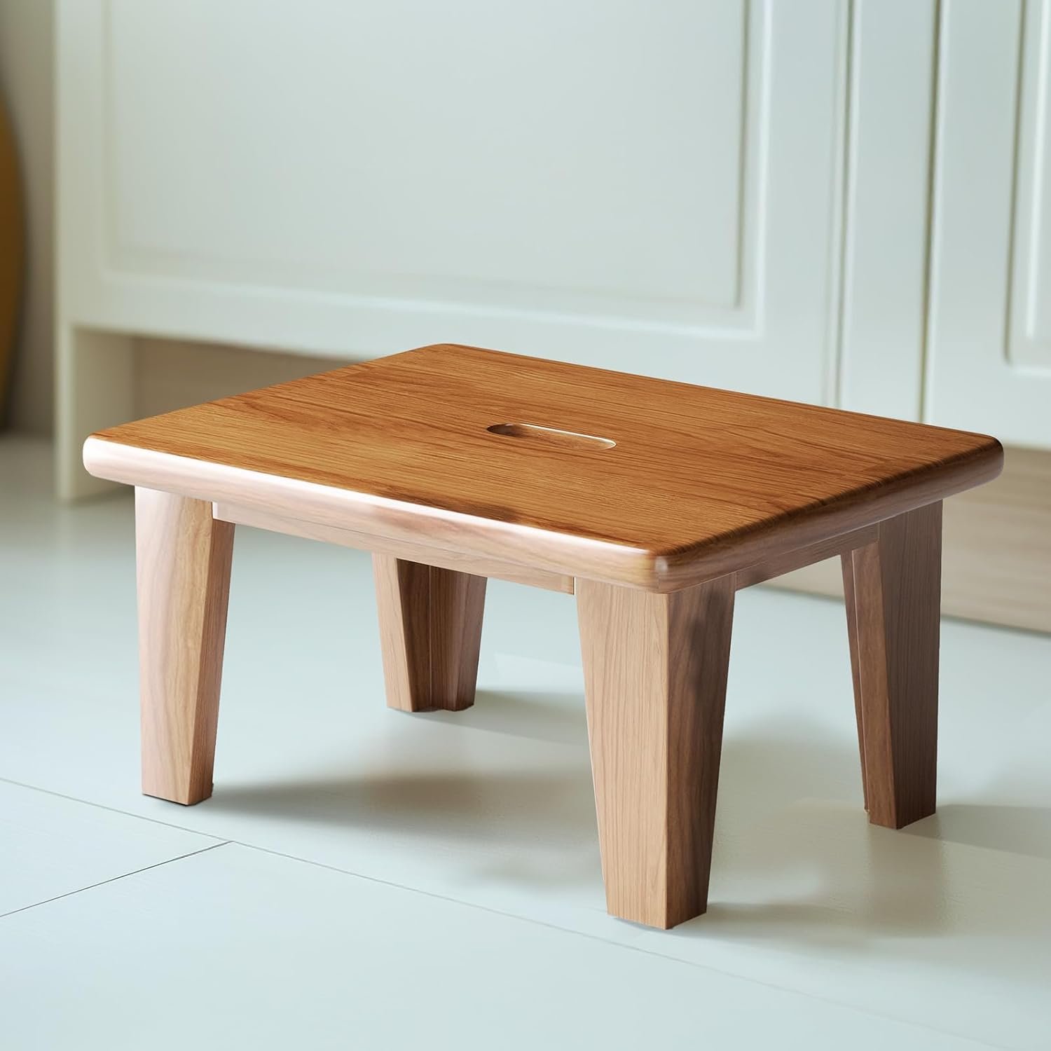 Water Resistance & Bulit-in Handle: The wooden footstool is lacquered throughout for excellent water resistance and has a built-in handle, for easy lifting and moving around the house, making it suitable for a variety of scenarios. wide stool can be used in kitchens, study rooms, bathrooms and bedrooms