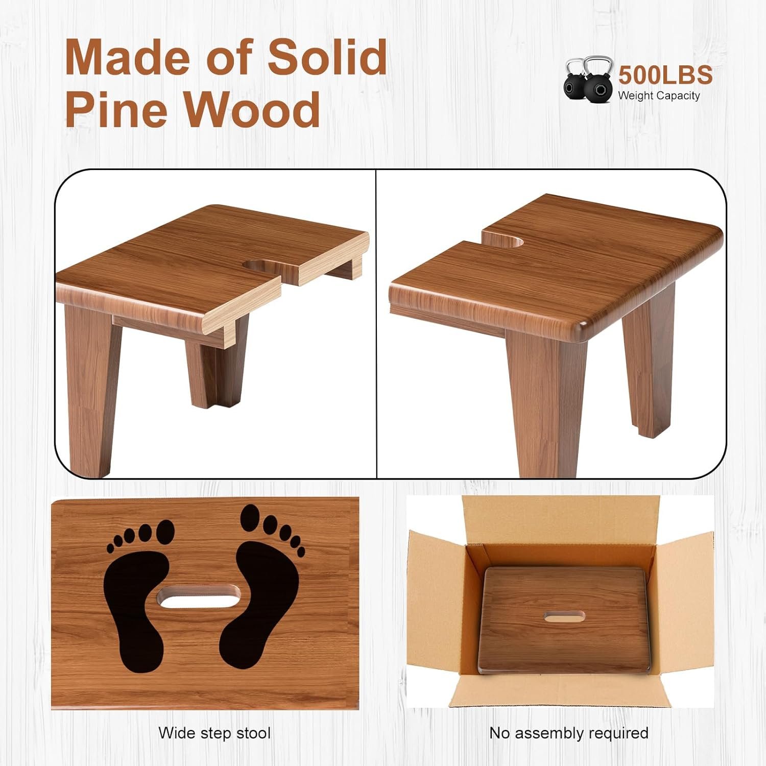 Up to 500lbs: bed step is stability and sturdiness come from every detail – We thicken the whole one step stool construction,especially in bench top, and raised and widened the kitchen step stool. These upgrades give the bathtub step stool a weight capacity of up to 500 pounds.