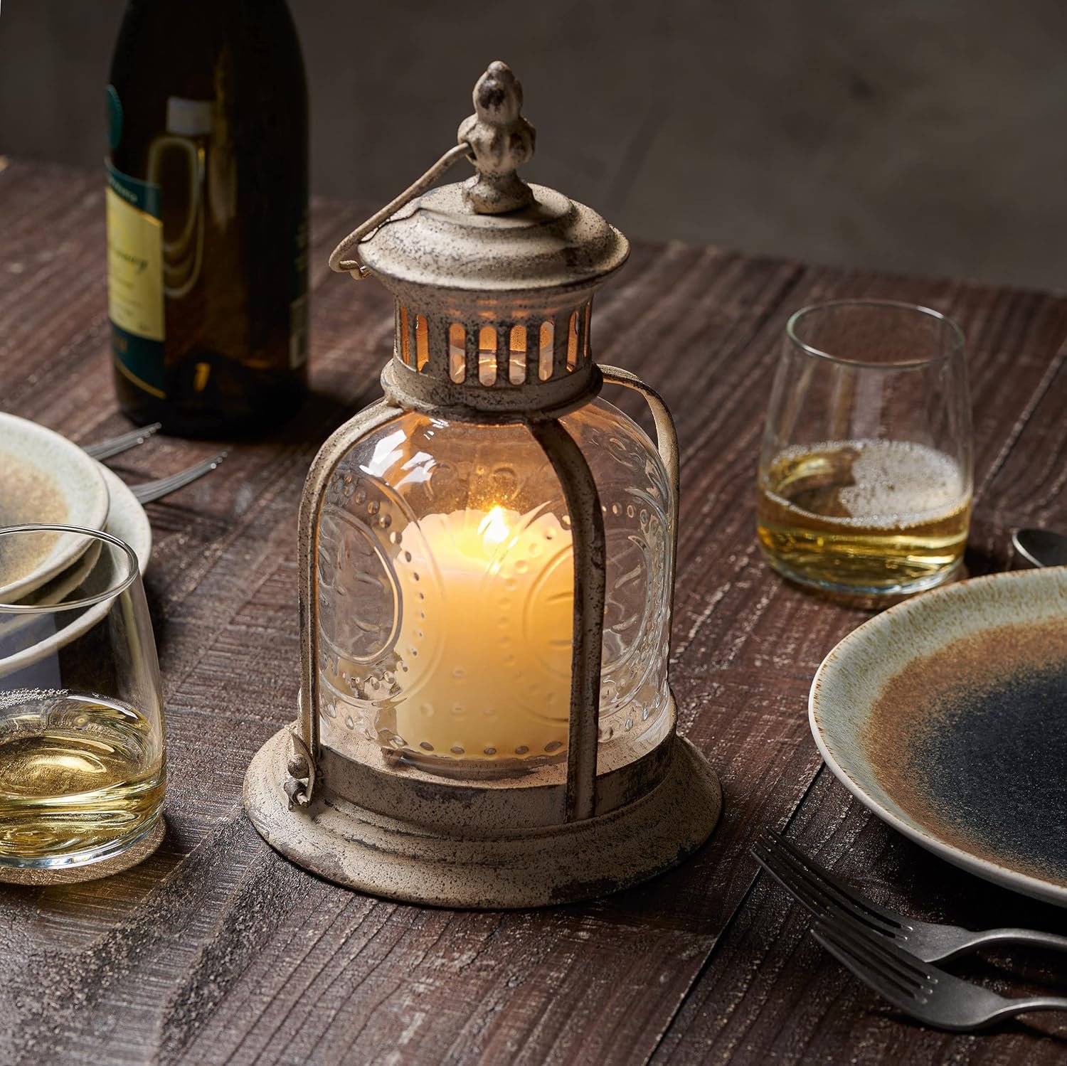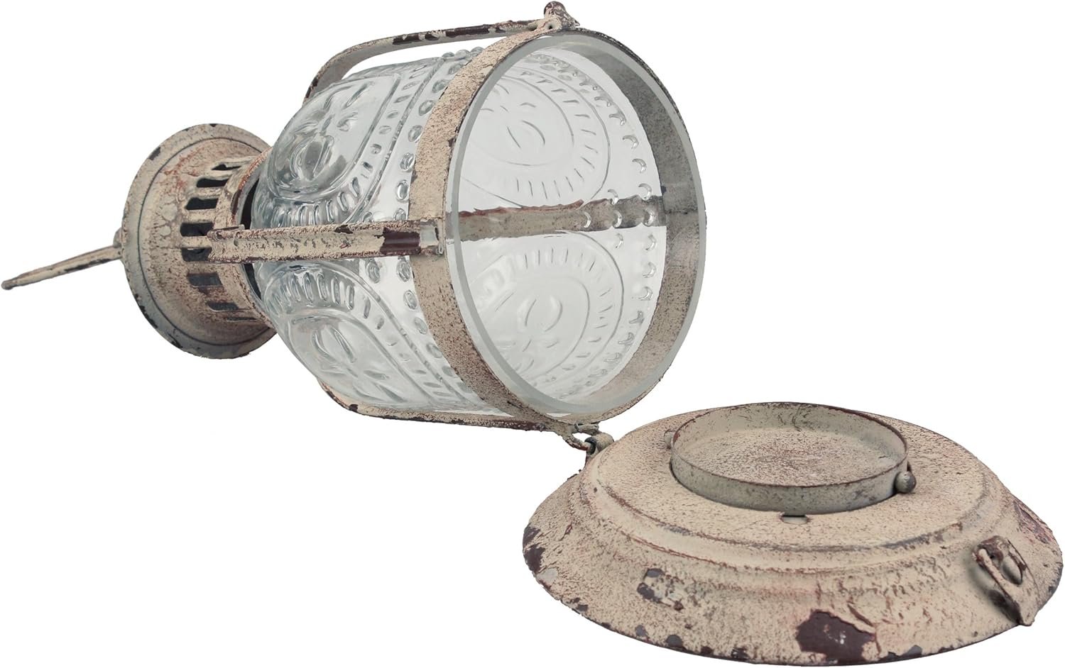 Metal cafe lantern is durably made with worn white painted metal with rust highlights & round pressed glass cover and is safe to use indoor or outdoor