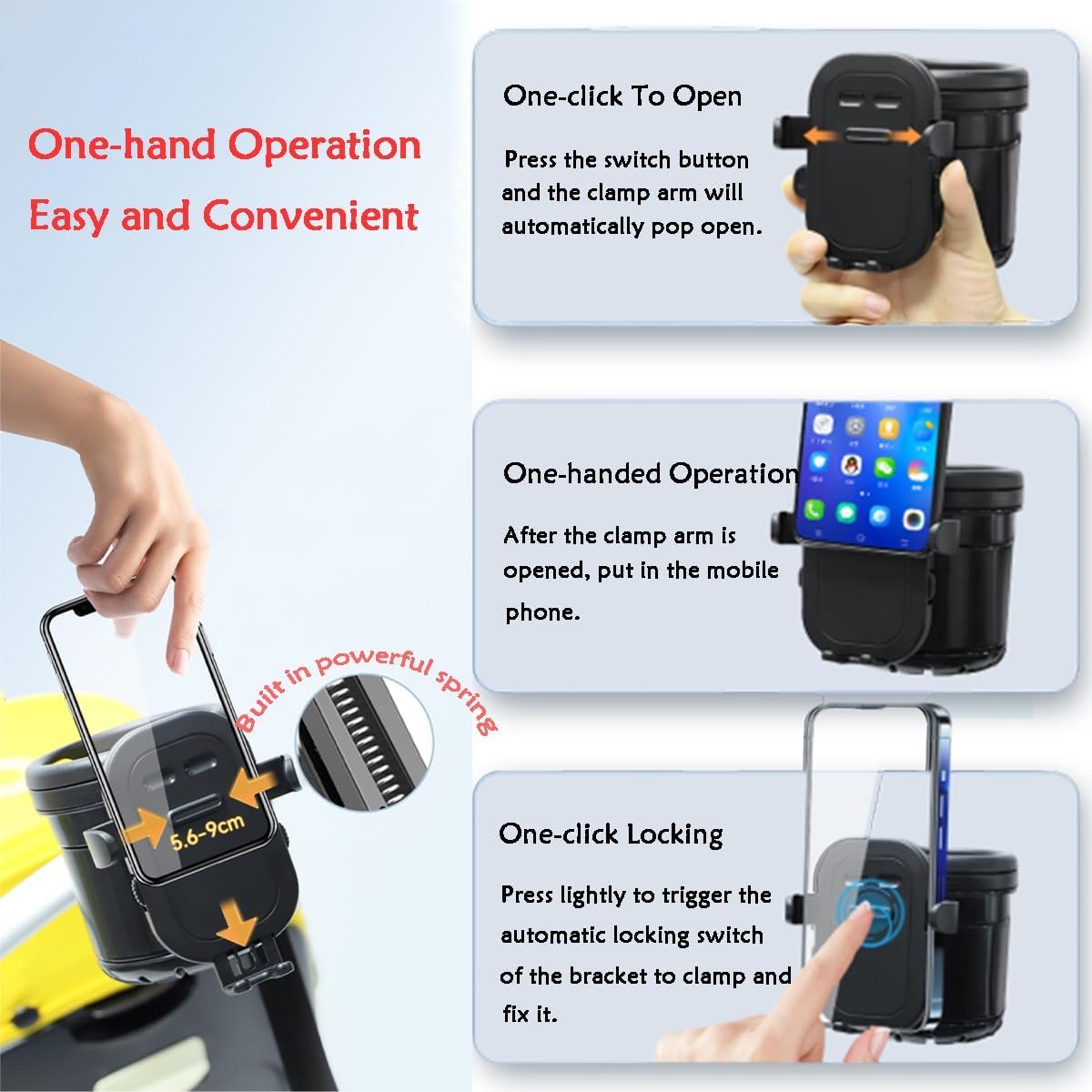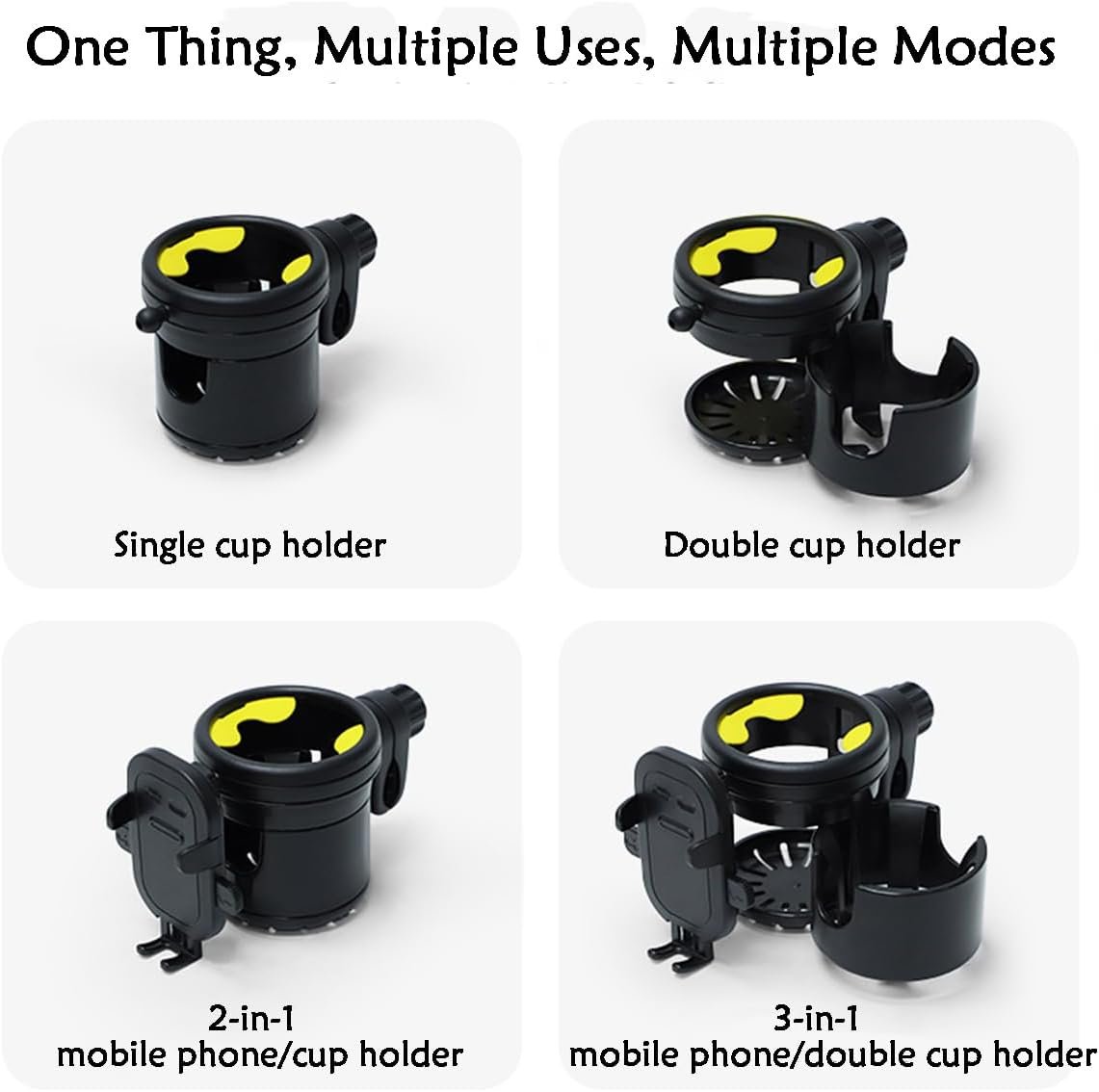 【4 Usage Modes 】Single cup holder/double cup holder/mobile phone holder + single cup holder/mobile phone holder + double cup holder,4 modes can be switched at will.