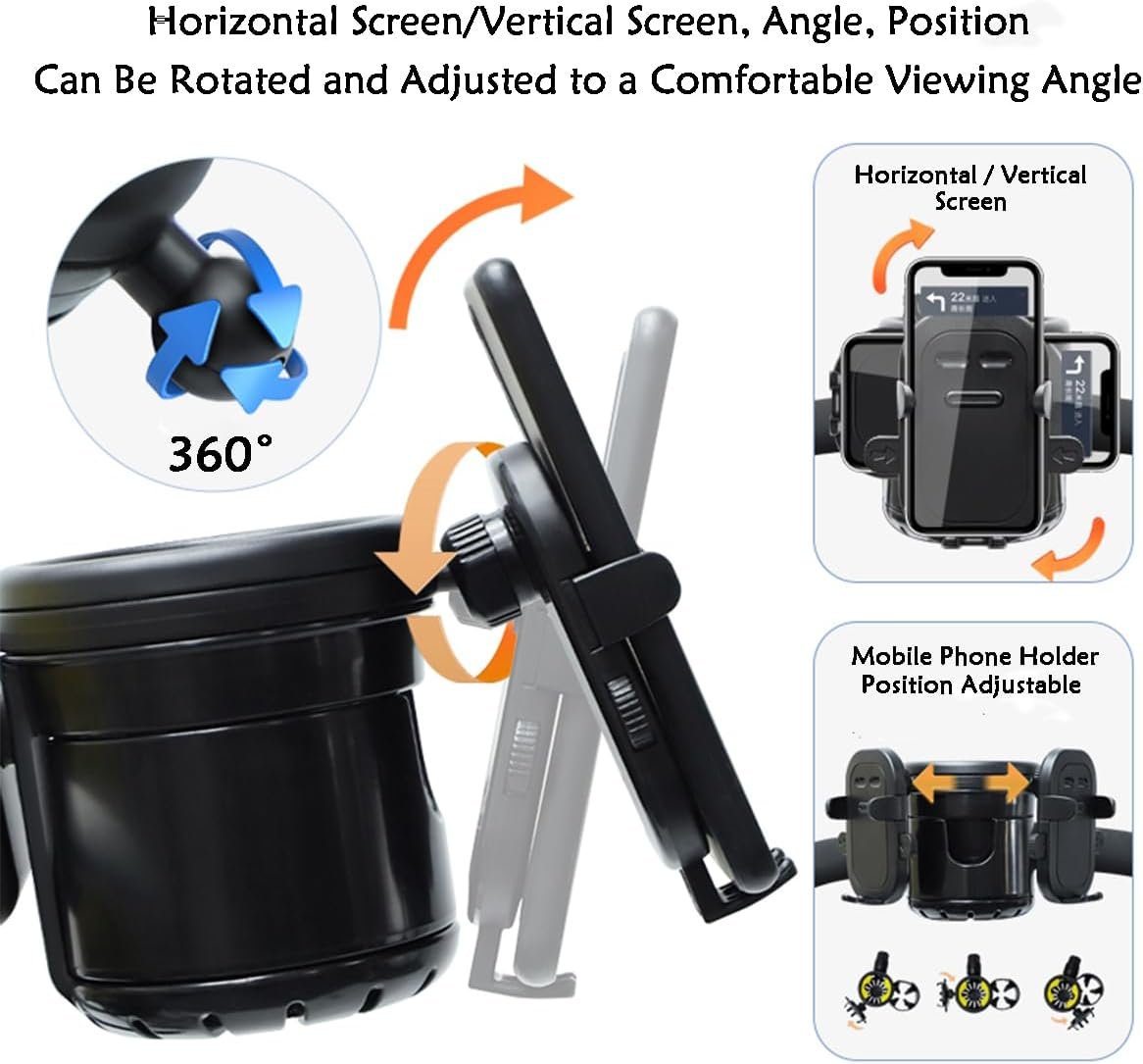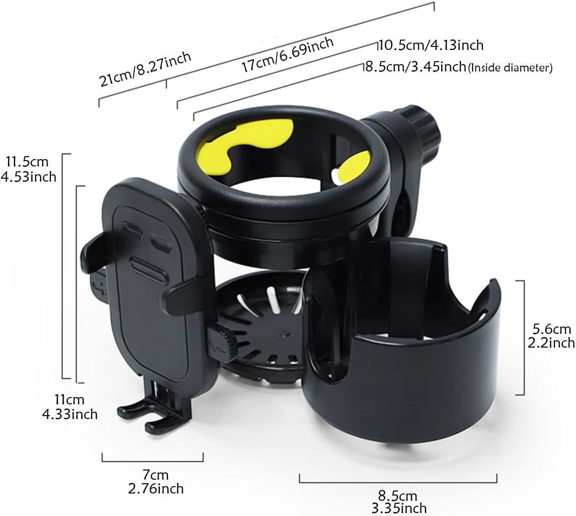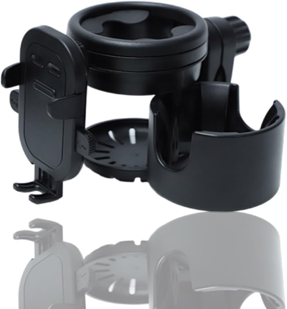 Stroller Cup Holder with Phone Holder,Bike Cup Holder,Freely Rotating and Adjustable 3-in-1 Mobile Phone/Double Bottle Holder for Stroller,Bike,Motorbike,Wheelchair,Scooter,Walker (Black)