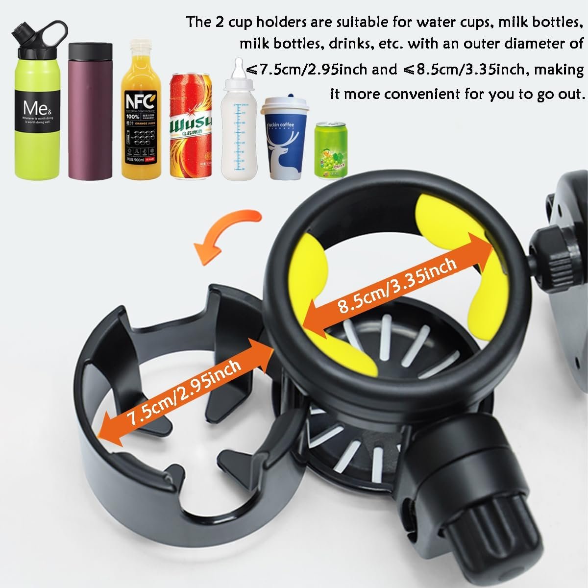The 2 cup holders are suitable for water cups, milk bottles, coffee, beer,drinks, etc. with an outer diameter of ≤7.5cm/2.95inch and ≤8.5cm/3.35inch, making, it more convenient for you to go out.