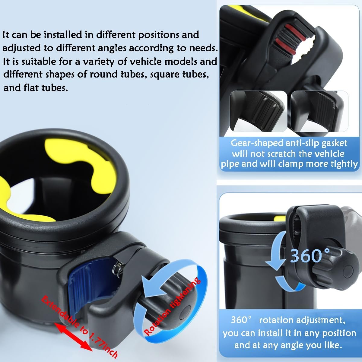 【Anti-slip Design】The anti-slip design of the clip ensures that it will not move when clamped tighter, and will not scratch the handlebar. The clip can be rotated 360° and can be installed on both horizontal and vertical pipes.