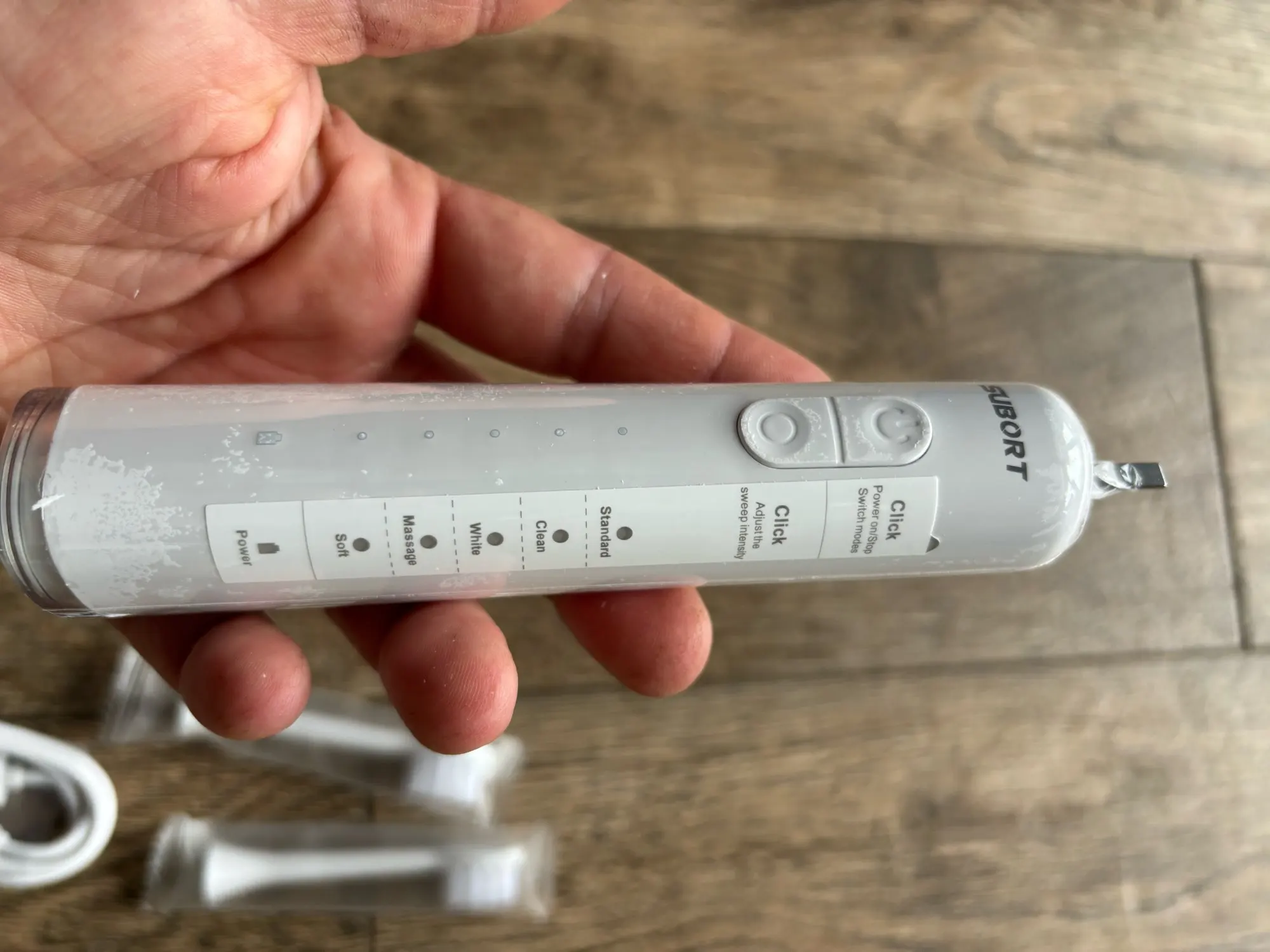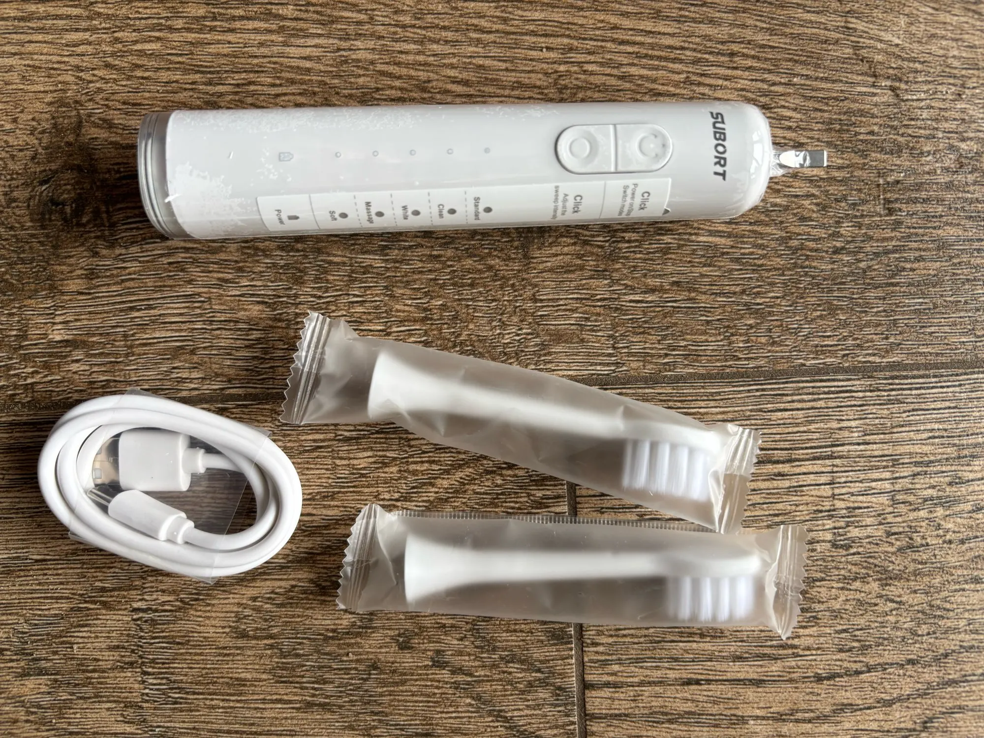 La première impression est très positive – la brosse à dents électrique Subort semble solide et semble bien faite. Les matériaux utilisés sont agréables au toucher et semblent durables. L’ensemble comprend deux embouts et un câble de charge, ce qui est une avantage significatif.