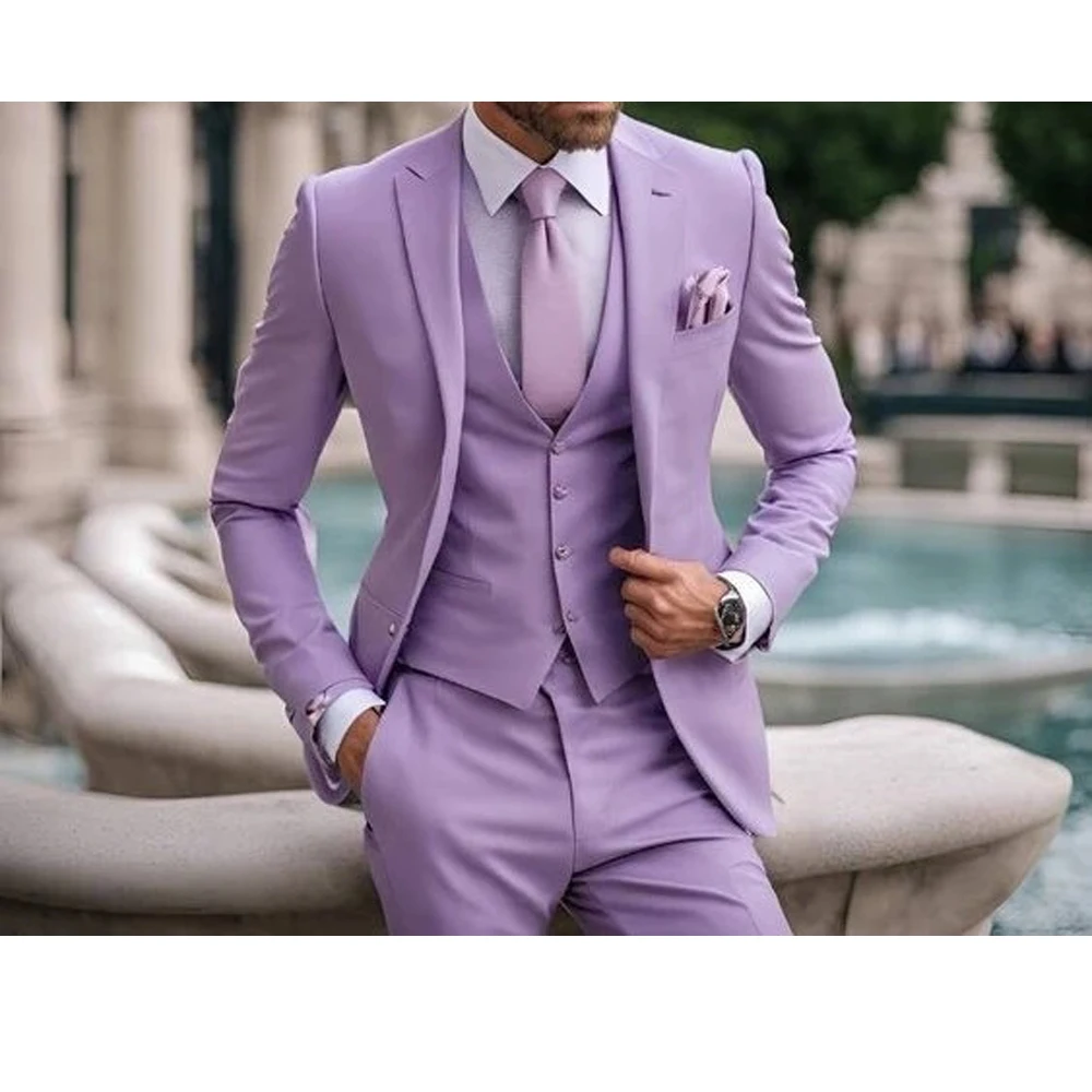 Suits for Men Lilac Stylish 3 Piece Classic Tuxedos Blazer Vest Pants Formal Elegant Male Wedding Groomsman Bespoke