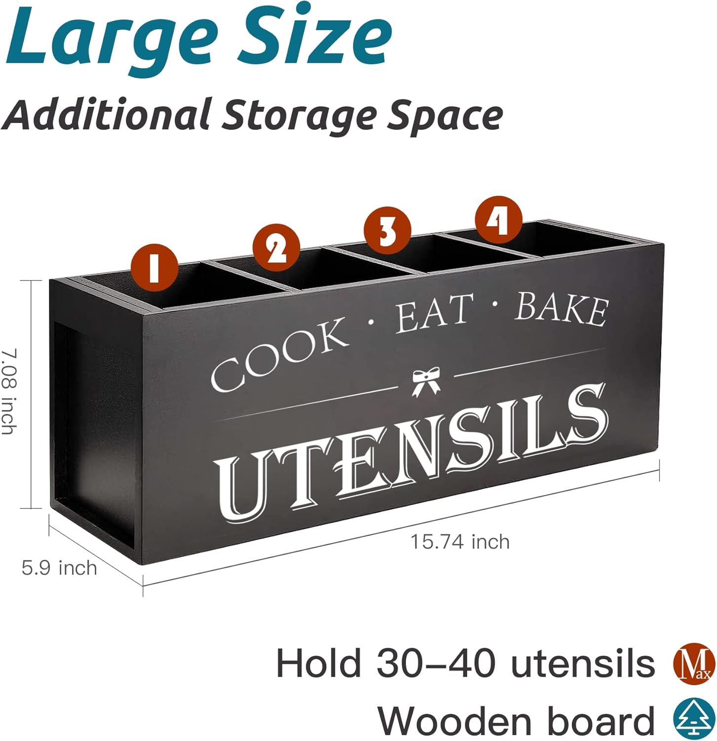 Suli Extra Large Kitchen Utensils Holder with 4 Compartments, Wooden Utensil Organizer for Kitchen Countertop, Farmhouse Kitchen Decor, Rustic Cooking Utensil – Black