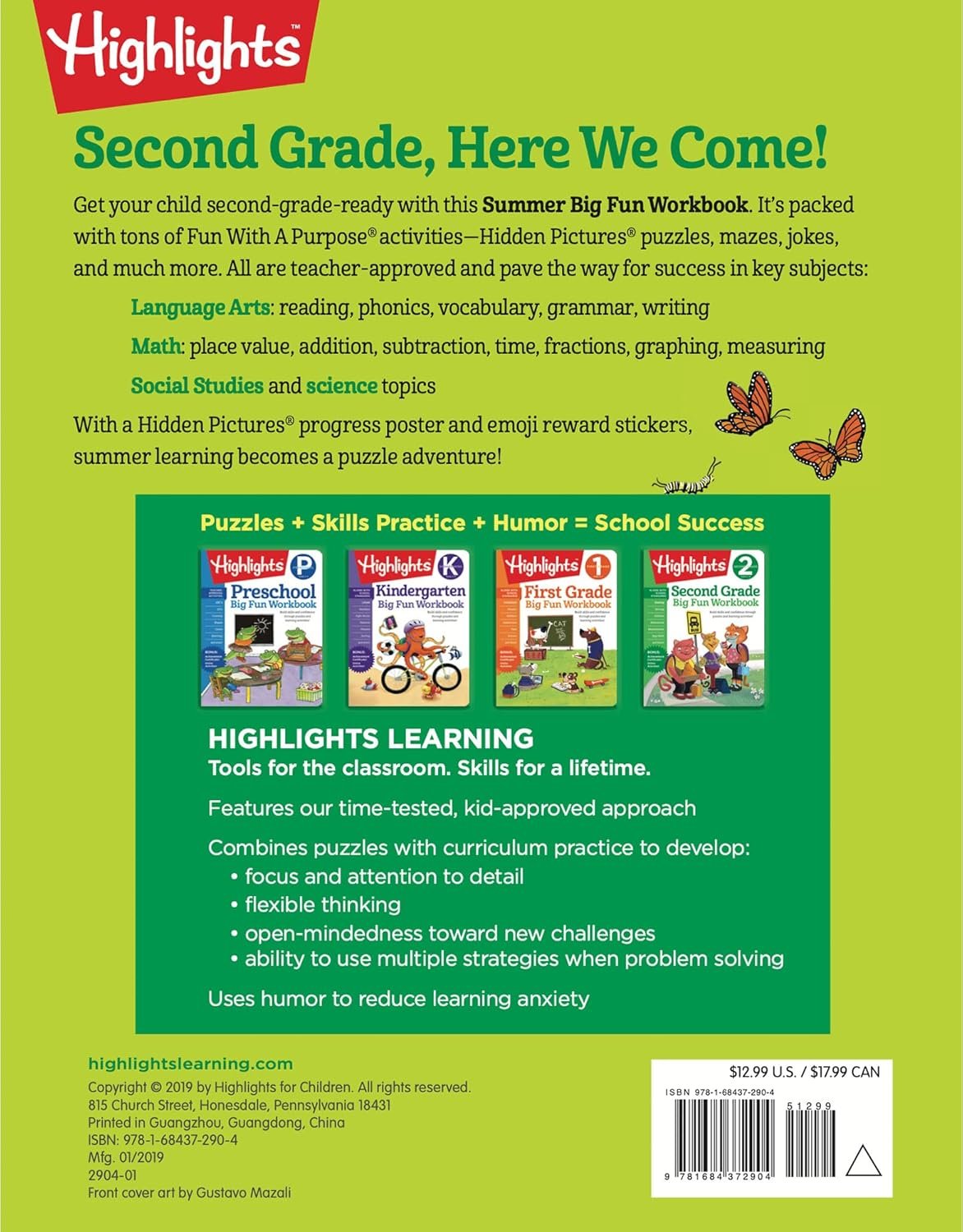 Get your child second-grade ready with this Highlights Summer Big Fun Workbook, packed with tons of Hidden Pictures puzzles, mazes, jokes, and more teacher-approved activities that pave the way for school success and make summer learning an adventure!