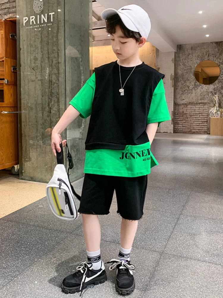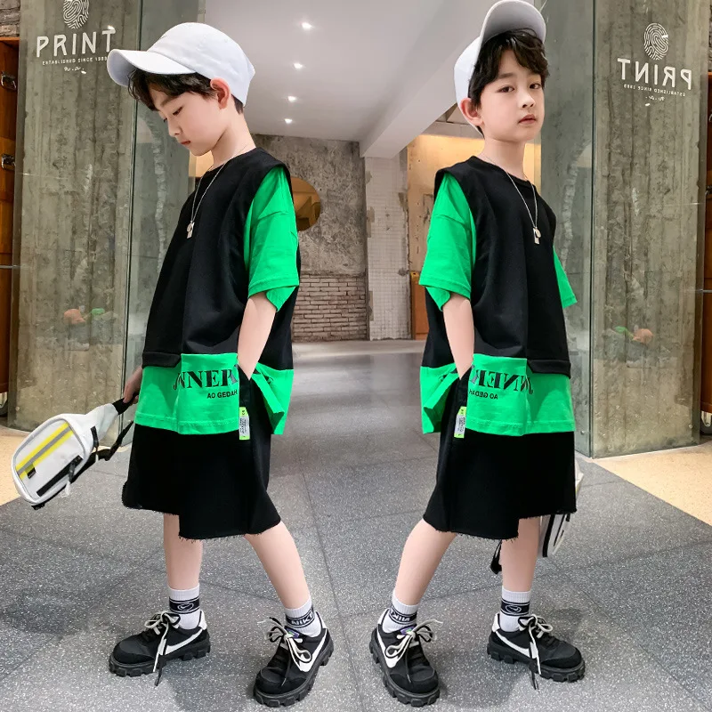Summer Children Boy Clothes Set Kid Faux Two-piece Letterr Printed Tshirts and Shorts 2 Pieces Suit Teenage Top Bottom Outfits
