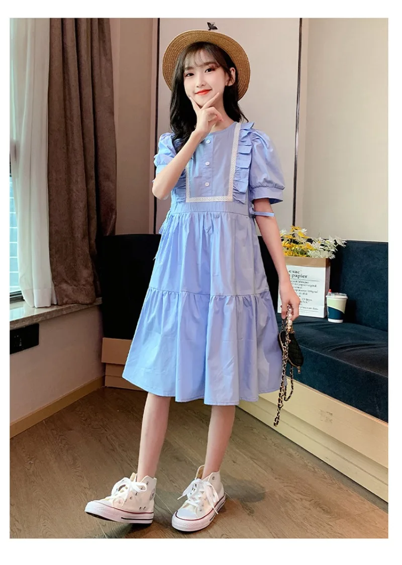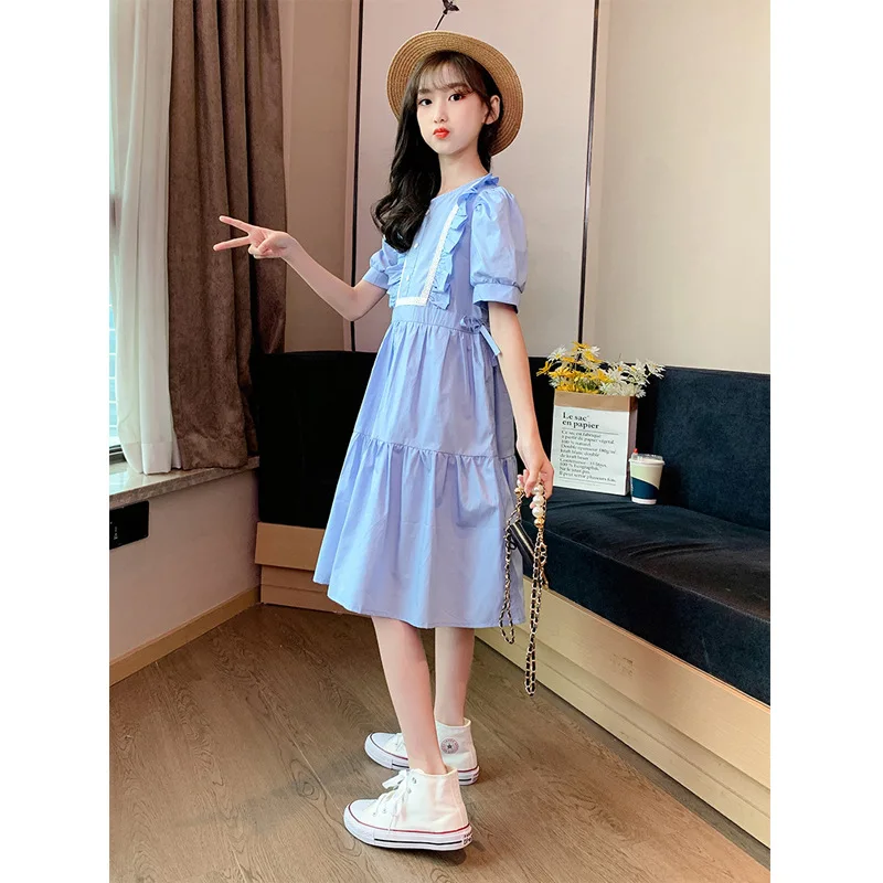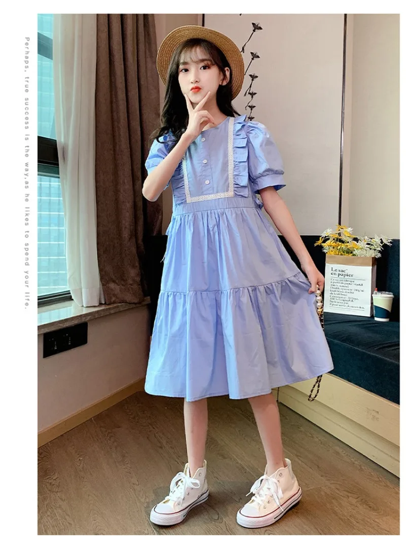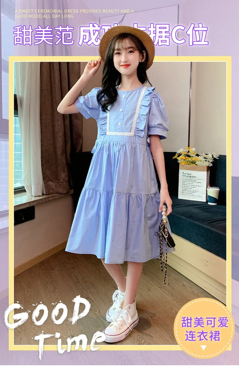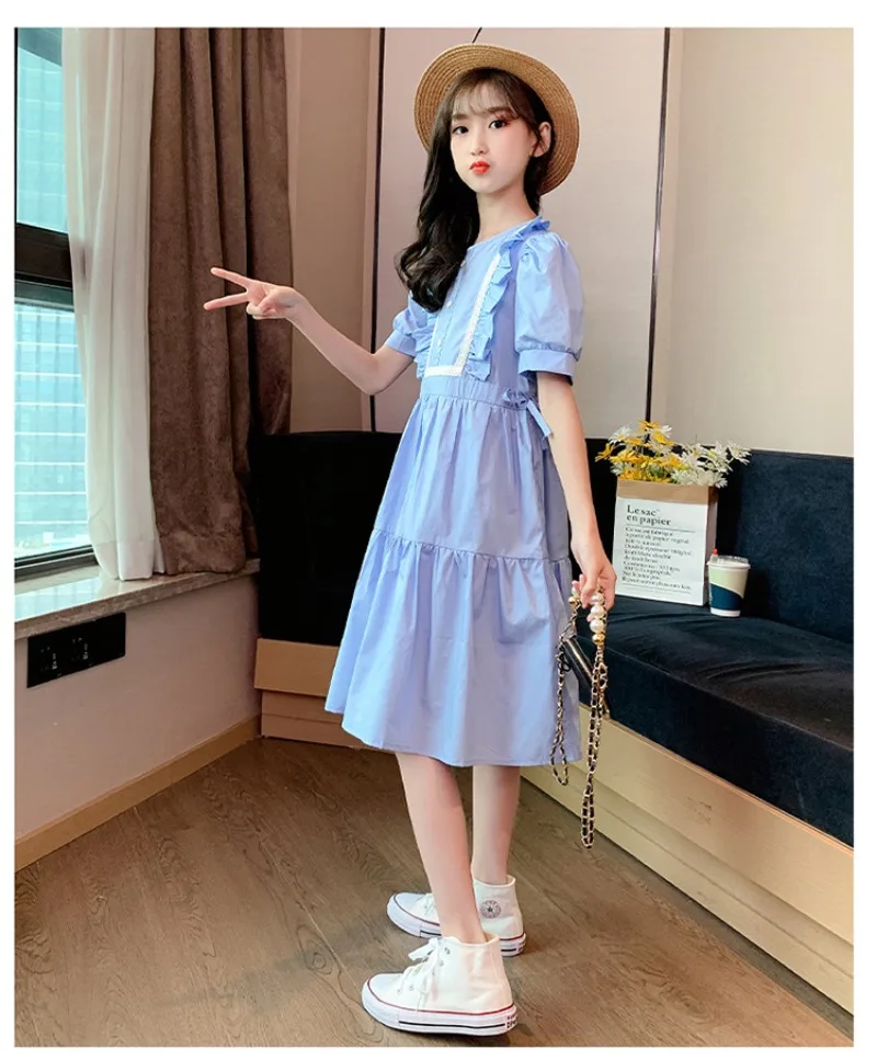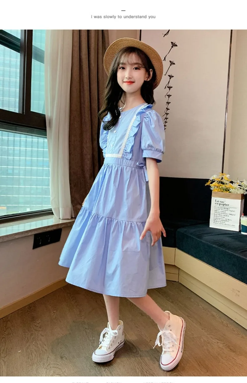 Summer Children’s Clothing for 4-14 Y Blue Princess Dress College Style Dress Waist Casual Middle School Student Clothing Dress