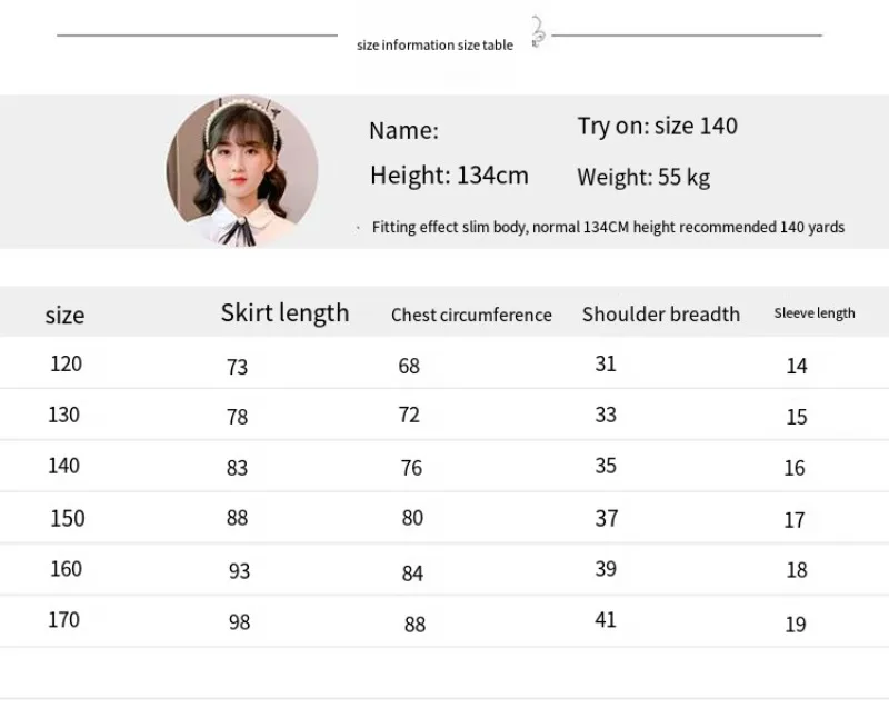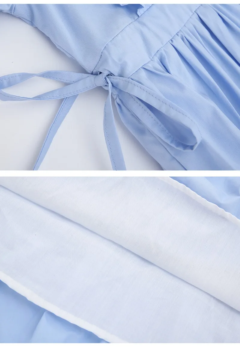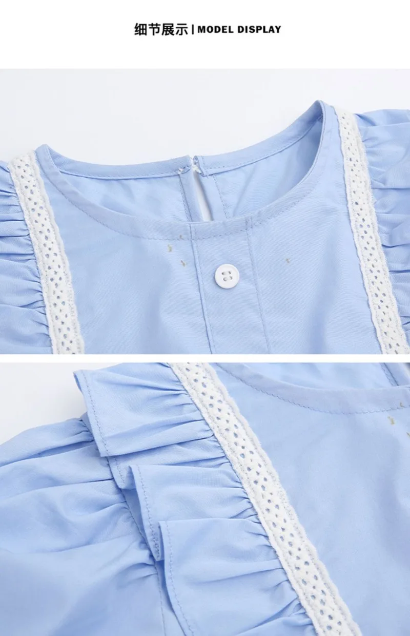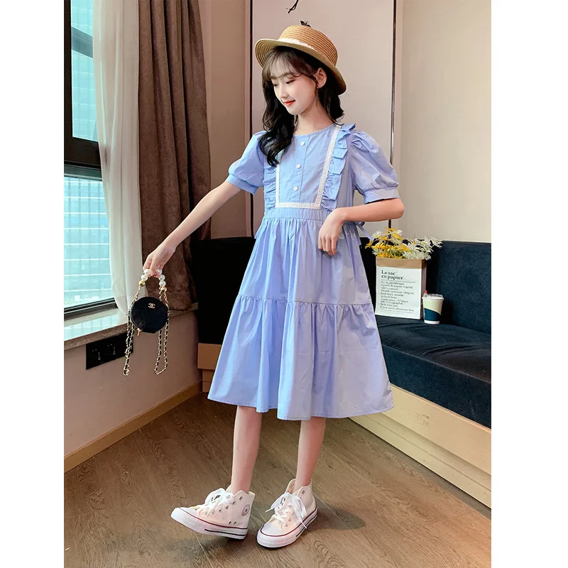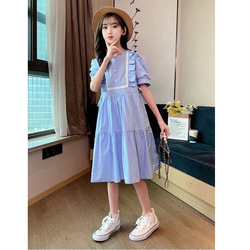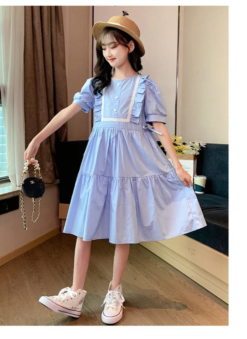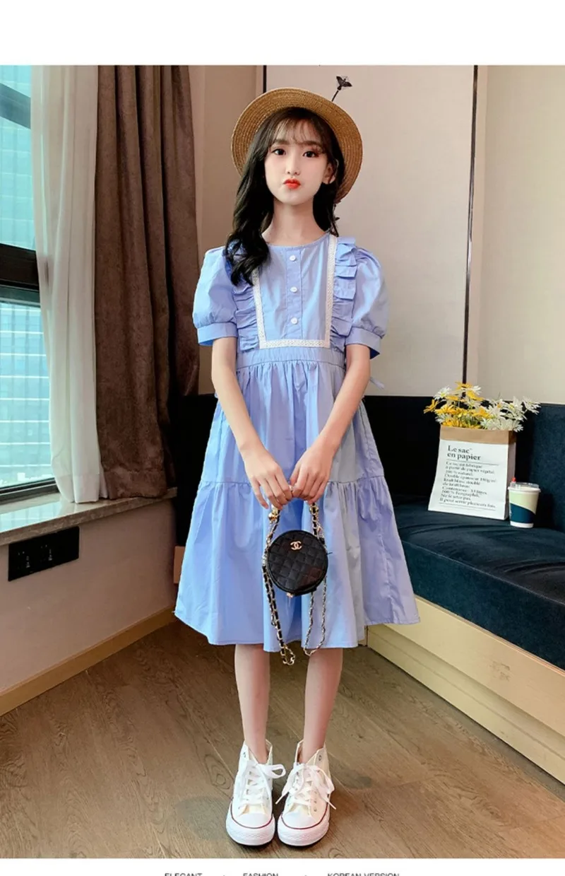 Summer Children’s Clothing for 4-14 Y Blue Princess Dress College Style Dress Waist Casual Middle School Student Clothing Dress