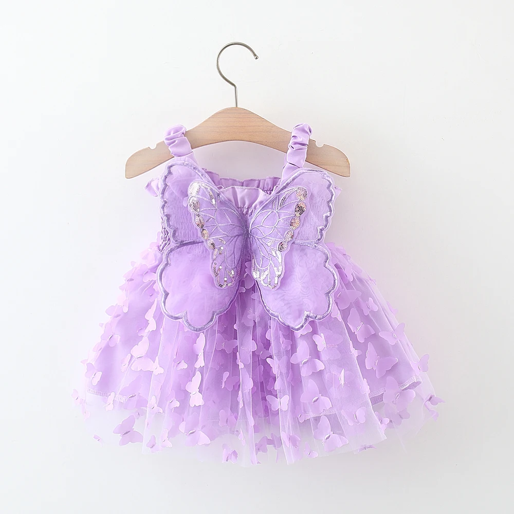 Summer girl’s camisole dress solid color butterfly 3D printing sleeveless mesh splicing butterfly wing fluffy skirt