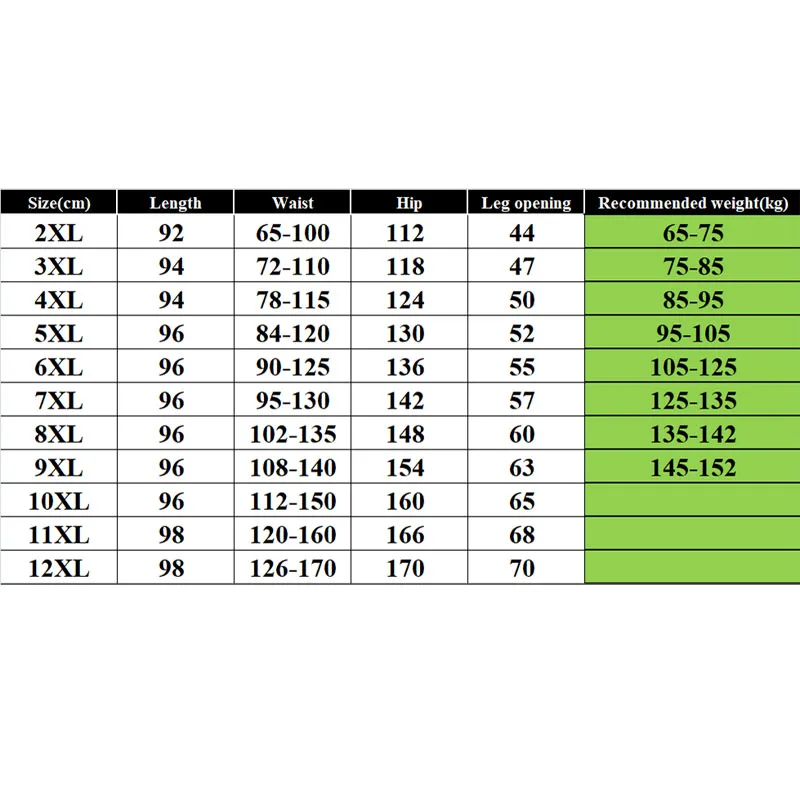 7XL Length:96 Waist:95-130 Hip:142 Leg opening:57 Recommended weight(kg):125-135
