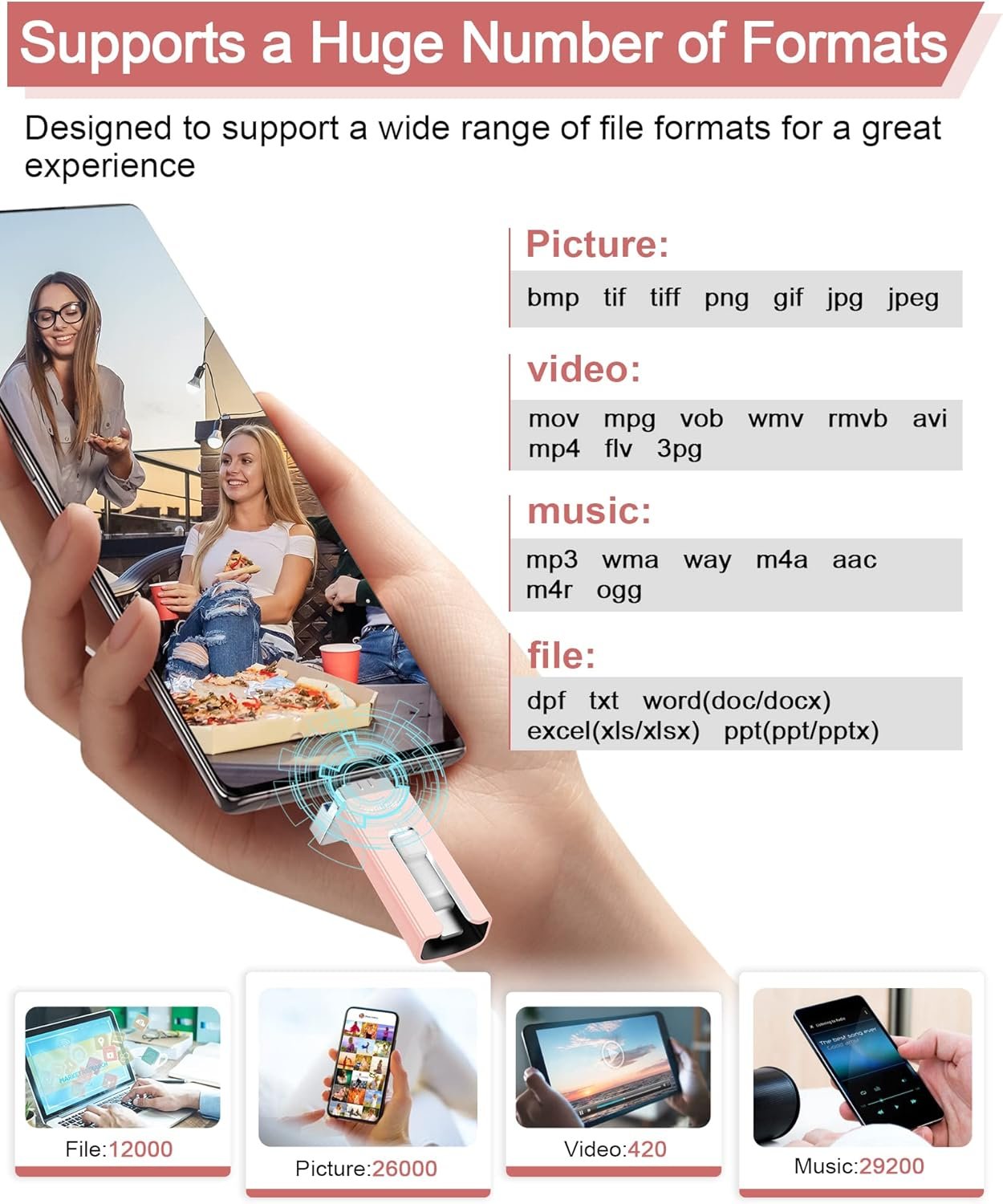 Please Note: 1.The phone case may prevent the proper connection between a phone and a USB flash drive, which could result in the phone being unable to recognize the USB flash drive. In this situation, please do not conclude that the usb flash drive cannot be used, remove the phone case and try again. 2.You can’t transfer or watch media files downloaded from iTunes or other 3rd party apps, because these files are Digital Rights Management protected. 3.Sometimes iCloud will backup your files automatically. You need to download the files that are backed up by iCloud before transferring them to usb drive.