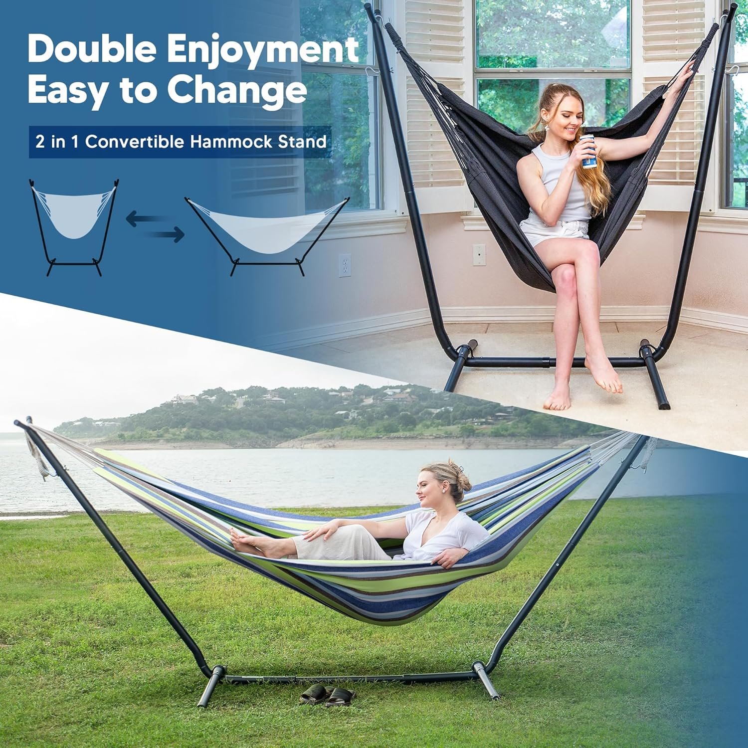 Double Enjoyment by Simple Adjustment: SUNCREAT 2-in-1 hammock stand could be adjusted to hammock chair stand by 2 steps. You will receive 1 double hammock bed, 1 hammock chair, and 1 convertible stand which can be adjusted to hammock stand or hammock chair stand. You could enjoy the double hammock with family or have fun on the hammock chair by your choice.