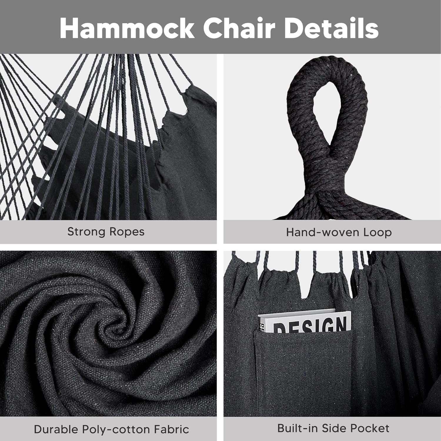 Extra Large Hammock Chair (When Use with Hammock Chair): The swing hammock chair is made of high-grade poly-cotton fabric – comfortable, durable, and no strange odor. The upgraded fabric size is 59 x 47 inches. It is huge enough, unlike other small chairs– which you could only sit on. This hanging hammock chair will let you lie down and enjoy the fully relaxation.