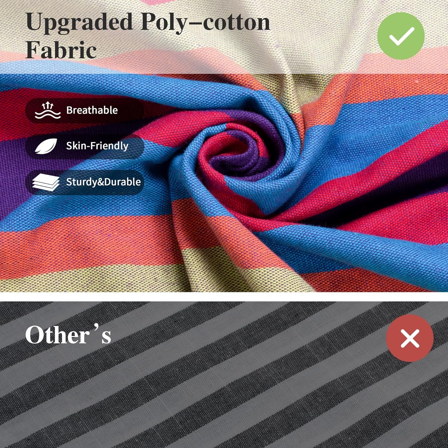 Upgraded Fabric: Our Brazilian Camping hammock is made of eco-friendly thicker version poly-cotton fabric (no lint, no odor, not pilling, not fading, skin-friendly, and breathable), stronger and much more durable than ordinary fabric hammocks. A comfortable cocoon style hammock can keep you safe while enjoying the peaceful leisure time