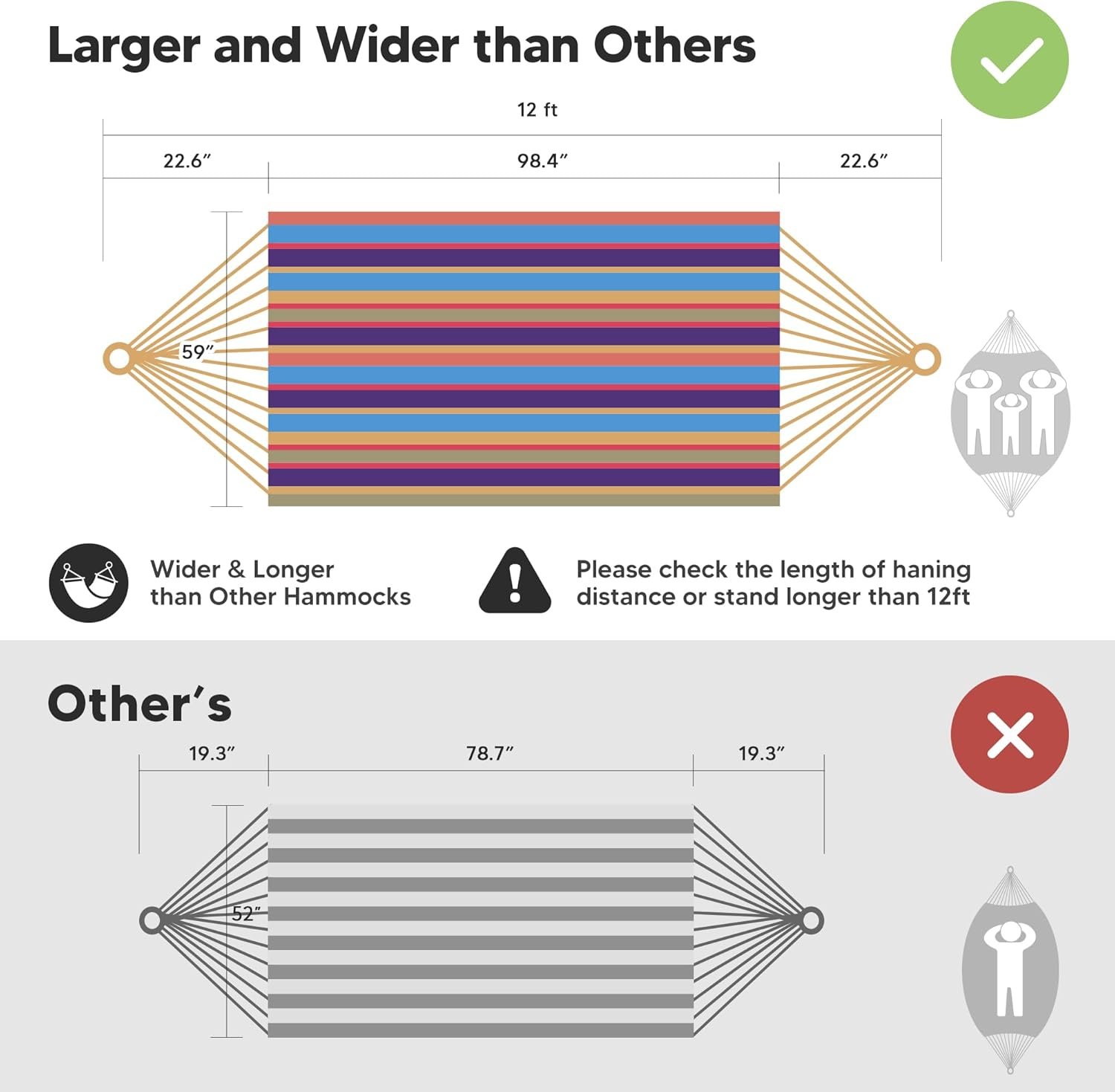 Larger Bearing Capacity: The heavy duty hammock’s total length (from loop to loop) is 144 Inches while the bed size is 98”long X 59”wide, making it perfect for couples