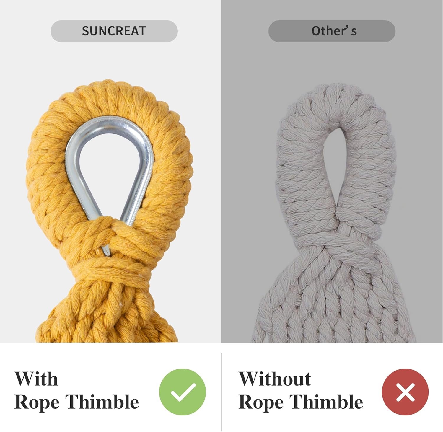 Handcrafted Ropes: The metal rope thimble is effective for preventing the long-term friction between the tree strap and the ropes, thus prolong the service life of the hammock. The 18 ropes at both ends of the hammock are made of poly-cotton, tightly braided and fixed, which greatly increase the load bearing capacity