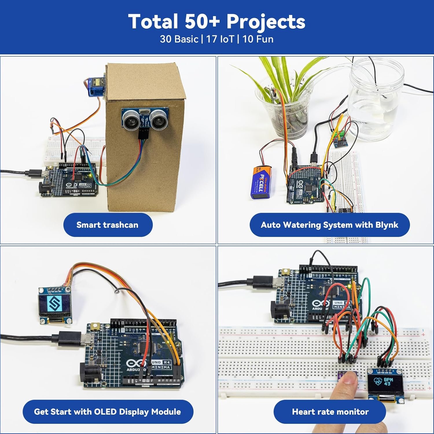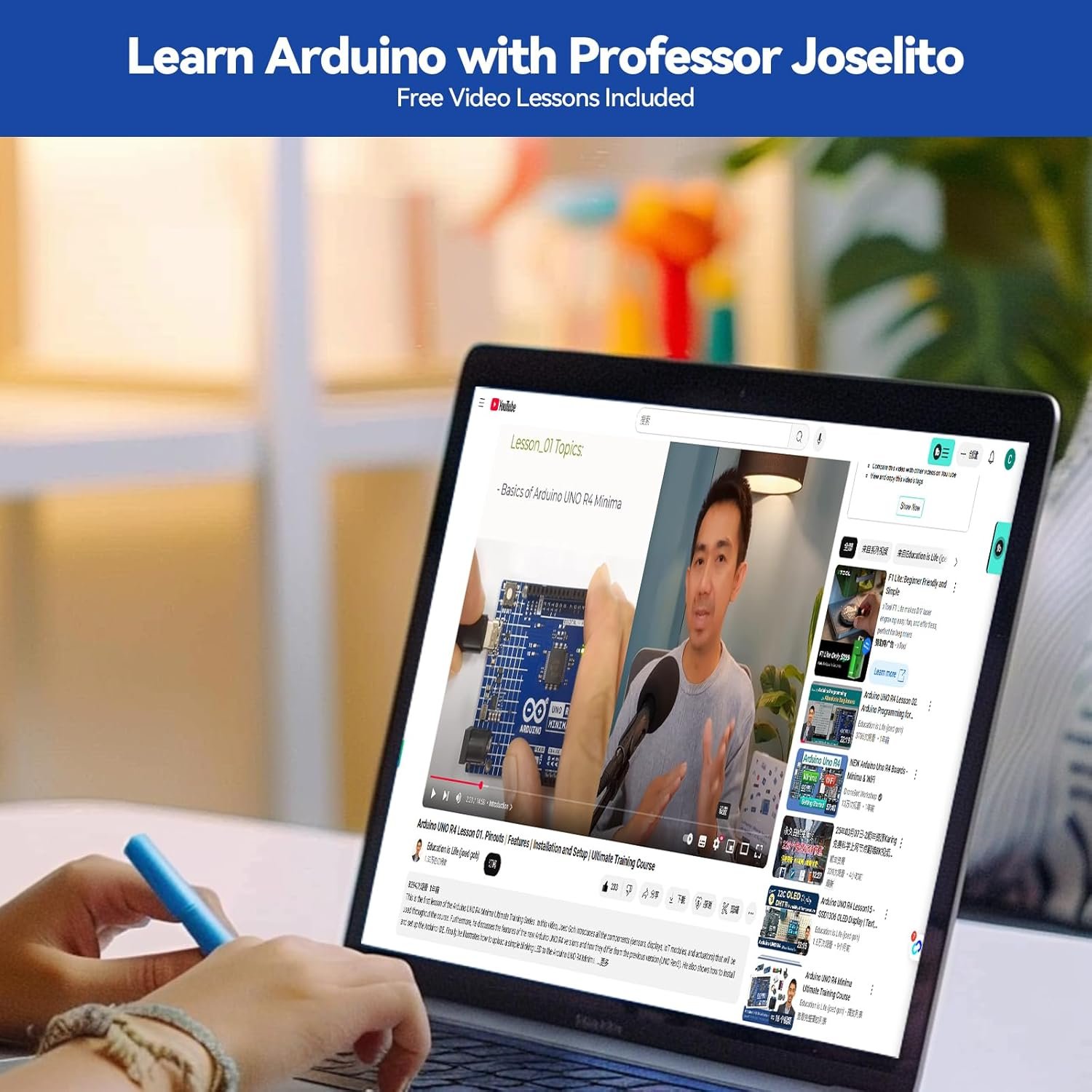 Ultimate Sensor Kit for Arduino Beginners: The kit features the original Arduino Uno R4 Minima board, 30+ high-quality sensors and modules, and free video lessons co-created with educator Professor Joselito. With over 50 engaging projects (30 basic, 17 IoT, and 10 advanced fun projects), beginners aged 8+ can dive into the world of electronics and programming with ease. Certified RoHS compliant, it guarantees safety and quality for all learners, making it the perfect choice for both education and innovation