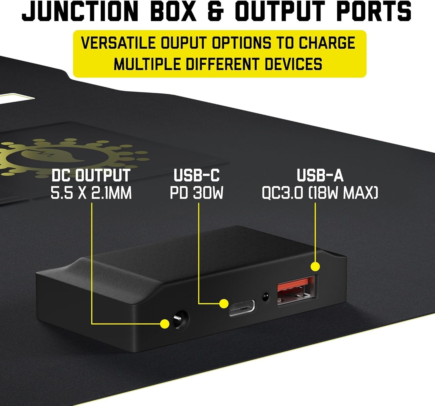 RUGGED & DURABLE: Designed for all weather conditions and environments. The waterproof ETFE exterior layer improves performance and durability, extends the panel’s lifespan and requires far less maintenance when compared to a PET exterior layer that is used by most portable solar chargers. The USB ports are waterproof rated IP67 – the PCB is coated with a waterproof seal and the junction box is silicone bonded to the panel. Waterproof, shock-proof, dust-proof and drop-proof. Designed for all weather conditions and environments.FOLDABLE, COMPACT & PORTABLE: Comprised from 4 connected solar panels, the panels fold down to the size of a laptop and easily fits into most backpacks. The integrated pocket provides storage space for electronics and accessories, and its mesh design intuitively allows proper airflow to prevent devices from overheating. The elastic straps secure phones, power banks and more during storage and transportation.POWERFUL & FAST CHARGING SPEEDS: With up to 40 watts of power, the monocrystalline panels with ETFE construction provide maximum efficiency and UV-ray permeability. The 21V DC5521 port (25.1V open circuit voltage) provides enough charging power for most power stations and DC powered devices, while the dual USB ports allow you to charge USB-C (PD 30W) and USB-A (18W max) devices. The ETFE construction provides a UV permeability of 95% compared to 80% from PET – makes the panels more efficient than other solar chargers.SMART TECHNOLOGY: The panel includes multiple smart IC chips allowing the USB ports charge simultaneously with the DC port, at the most efficient voltage, and provide the quickest, yet safest, charging speed. Short circuit, over-load, over-heat, over-charge, over-voltage, and current limiting protection. Automatic restore if shade occurs.PREMIUM FEATURES & DESIGN: Includes everything you need for seamless charging on the go. The built-in kickstands allow you to angle the panels towards the sun or, alternatively, attach the included carabiners to the panel’s grommets and hang the panels from different objects. The included adapter cable and DC plug adapters ensure compatibility with a wide range of devices.MULTI-USE: Compact enough to easily transport and powerful enough to charge most devices. Ideal for camping, backpacking, hiking, outdoor adventures and is essential in any disaster, emergency, and hurricane prep kit for survival. This panel can charge a wide range of electronic devices, including devices such as power stations that accept DC, as well as any USB device including your iPhone, Samsung, Pixel, iPad, laptops, power banks and more. An excellent solar charger for cell phone. Never be caught without power.SUNJACK: Purchase SunJack products with confidence. Designed and engineered in the USA and backed by a local American company. If you have any questions or experience any issues, we are here to help. With SunJack as your personal power companion, never be caught without power!