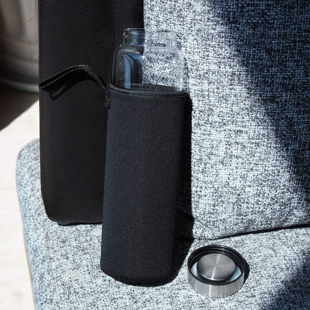 Glass water bottle with sleeve: The sleeve protects the bottle from bumps and scratches and Provides a non-slip gripping surface. NOTE: Neoprene has little smell, is totally normal and safe.