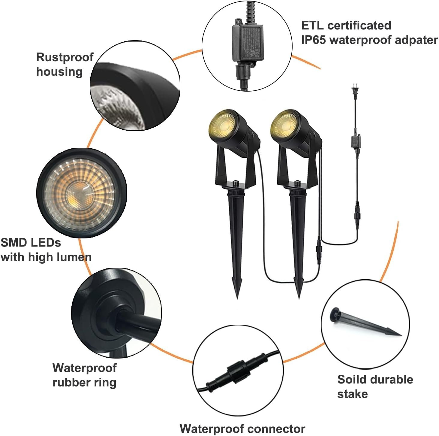 【Integrated LED Technology, No Need to Change Light Bulb】High-quality LED chips provide warm white glow. The upgraded lens makes the light well-balanced and glare-free without impact on eyes. LED landscape lights last longer than traditional lighting and use less energy