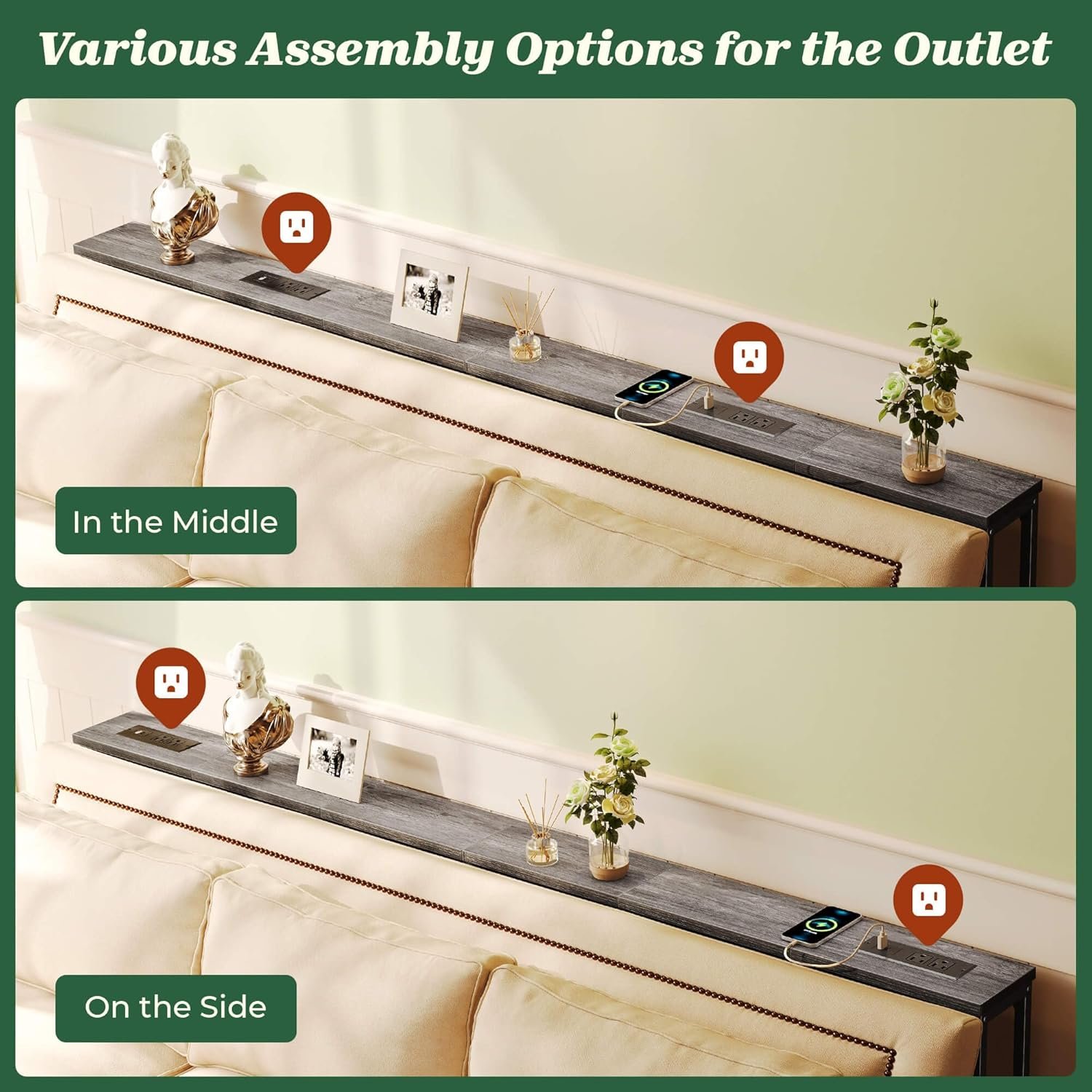 【Quick Assembly and Stability】With easy-to-follow instructions, simple construction, and included tools, you can have this sofa table with outlet assembled in just 15 minutes. For added stability, attach it to the wall, and use the adjustable feet to keep it level on uneven floors
