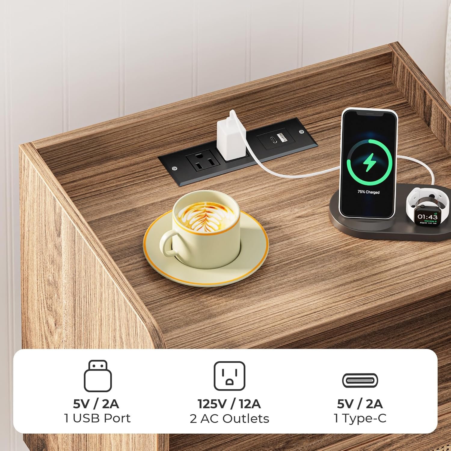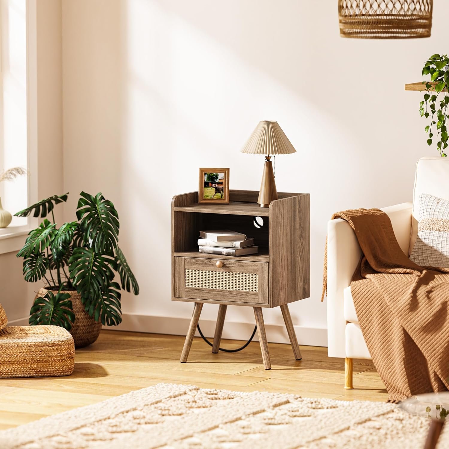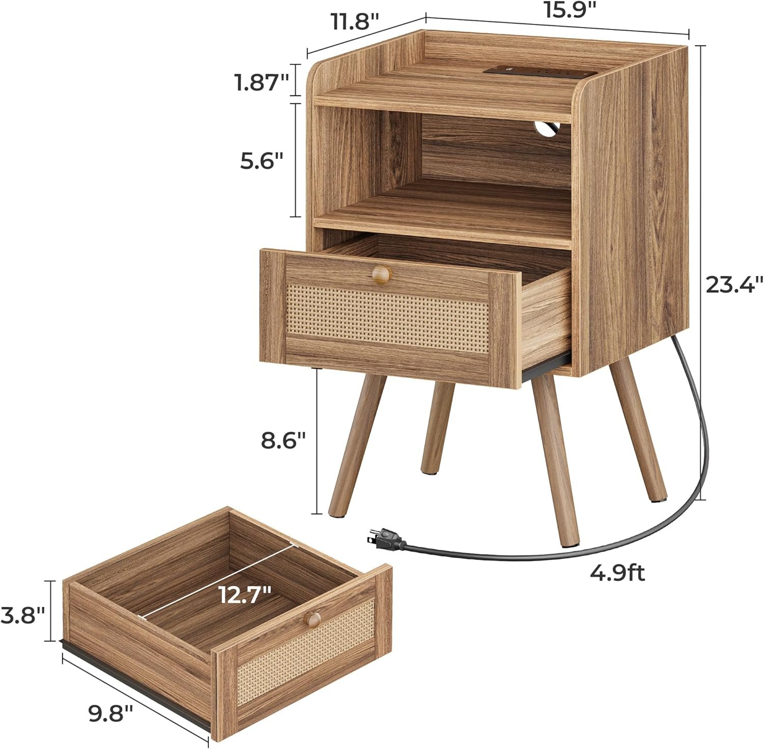 SUPERJARE Nightstands Set of 2, Night Stands with Charging Station & PE Rattan Decor Drawer, Bed Side Tables with Solid Wood Feet, End Table, for Bedroom, Living Room, Walnut