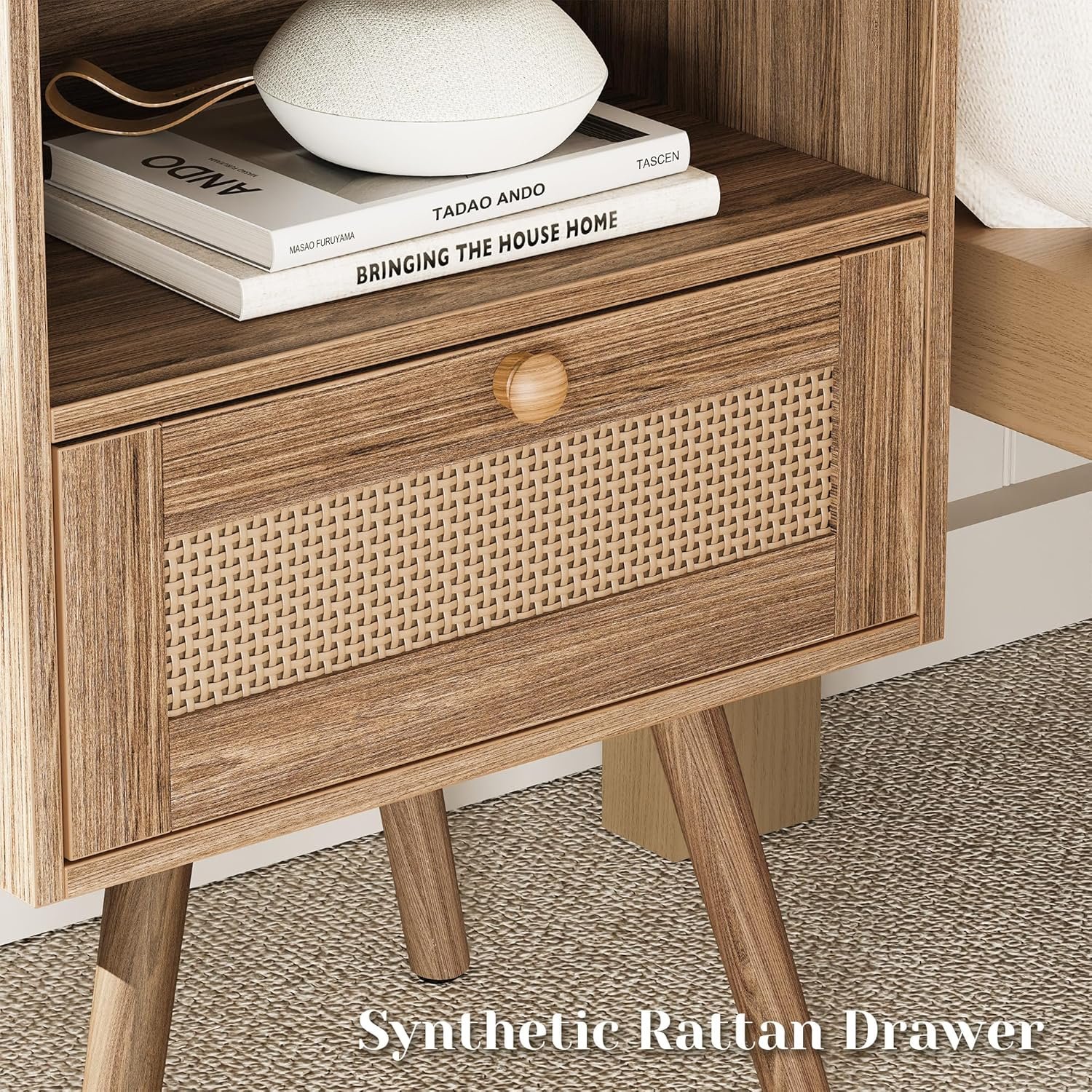 [Fresh and Elegant Style]: Need a storage table without disturbing the home colour balance? This rattan side table with walnut wooden colour is exactly what you need. What’s more significant, the PE rattan design on the drawer surface brings an irresistible and attractive boho vibe to your space