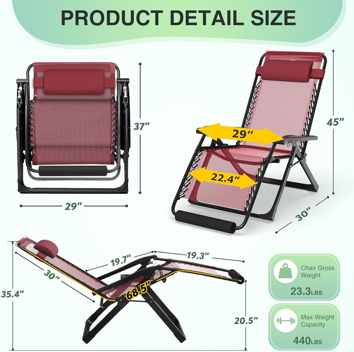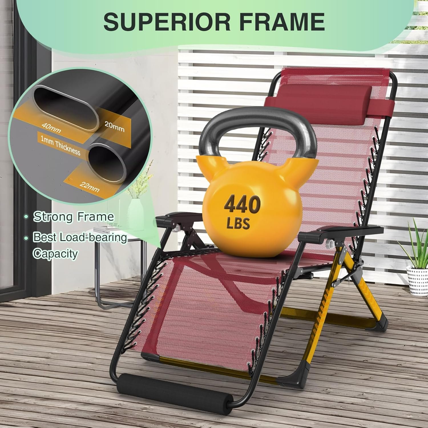 【More Sturdy and Durable】Upgraded zero gravity lounge chair can bear 440 pounds. 40mm(1.6inch) Thickened steel pipe can make the chair not shake and more stable, improve the bearing capacity and durability of the patio chair. Upgrade texlin fabric, double elastic bands,breathable mesh and removable soft cushions add extra comfort