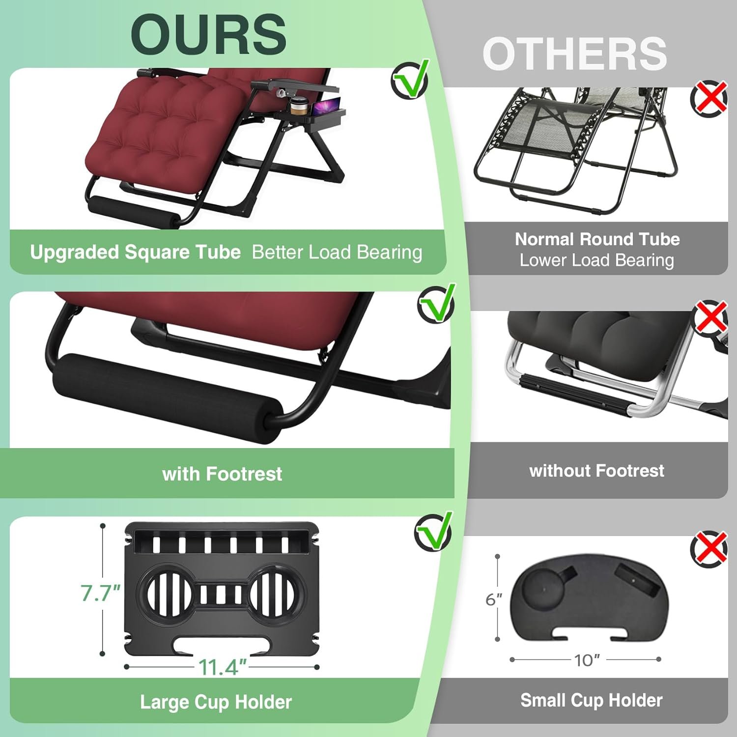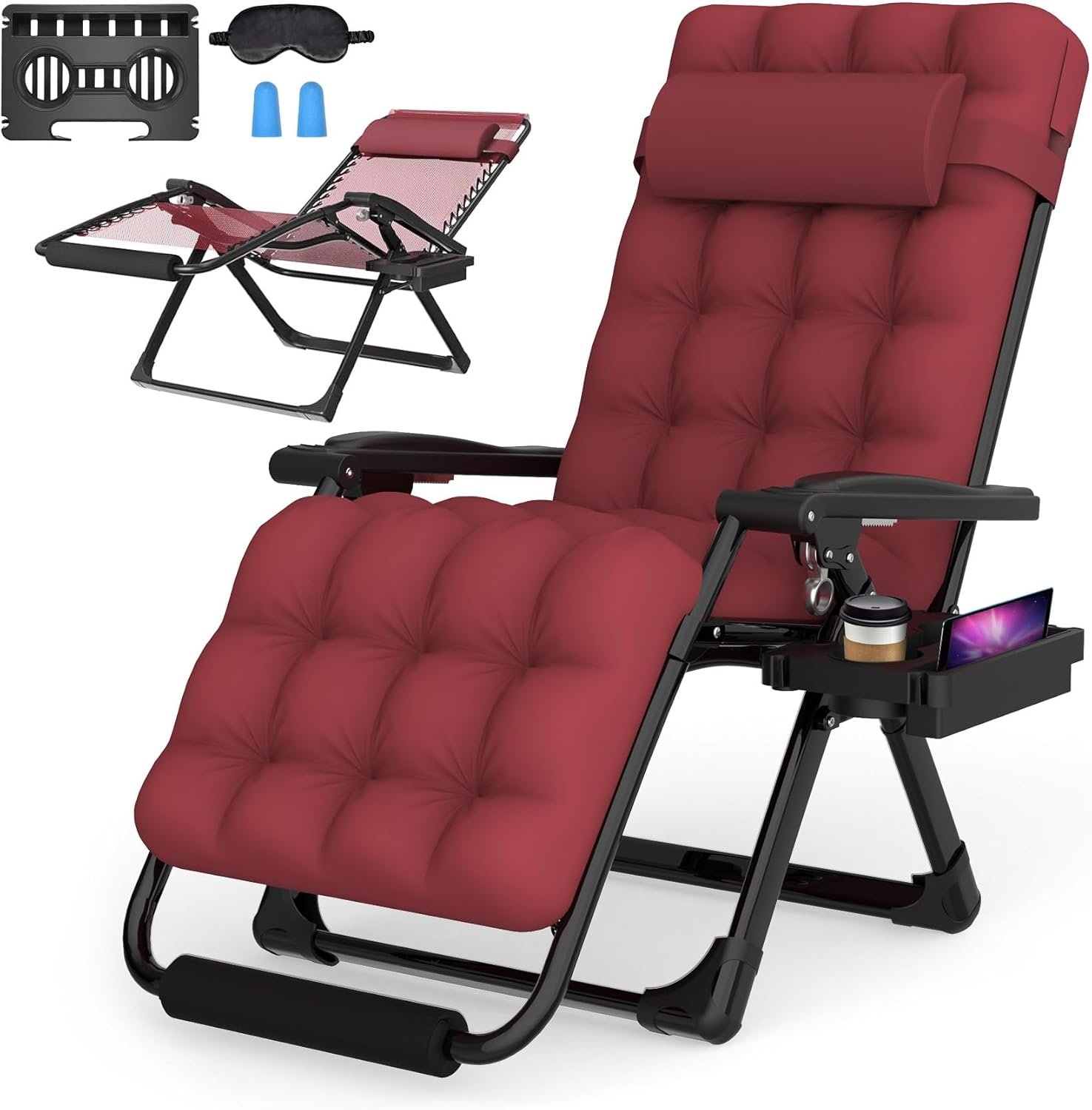 【Softer Cushion & Larger Cup Holder】Thickened 4″ cushion of the Zero gravity recliner is softer and more comfortable. The cushion is removable, and has good ventilation even in summer, which is convenient for use in winter and summer. Multifunctional Large Cup Holder size: 11.4″L x 7.7″W, can not only store mobile phones, water glasses and keys, etc., but also hang bags