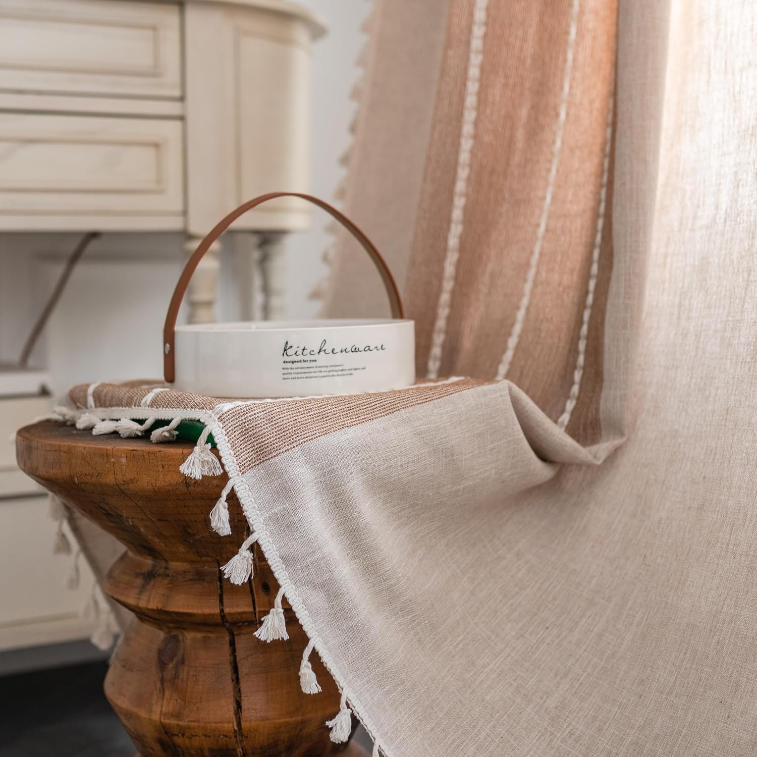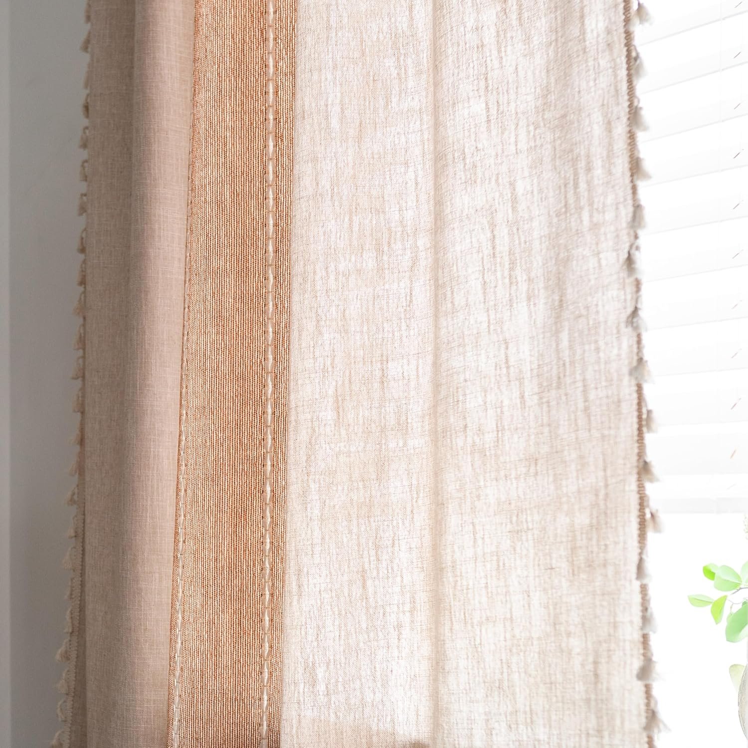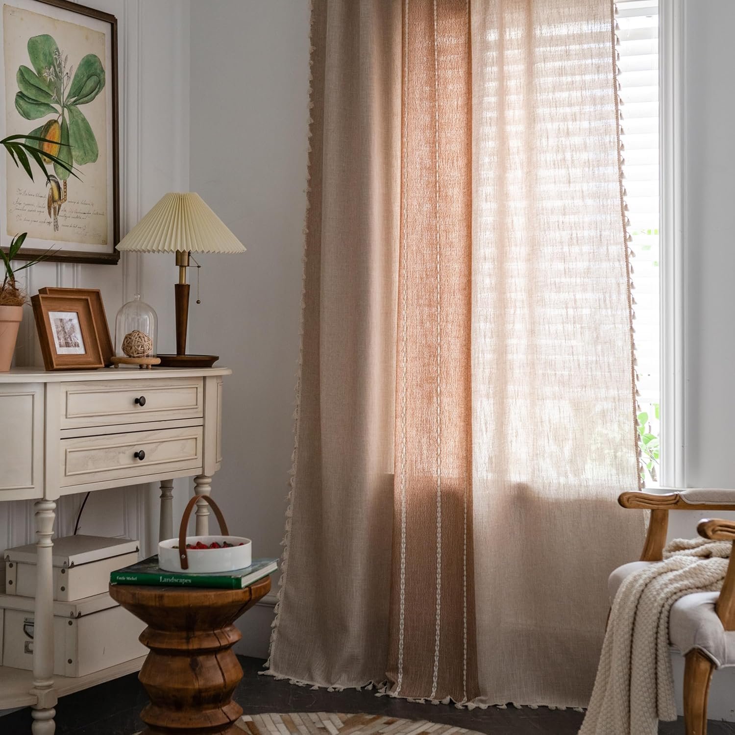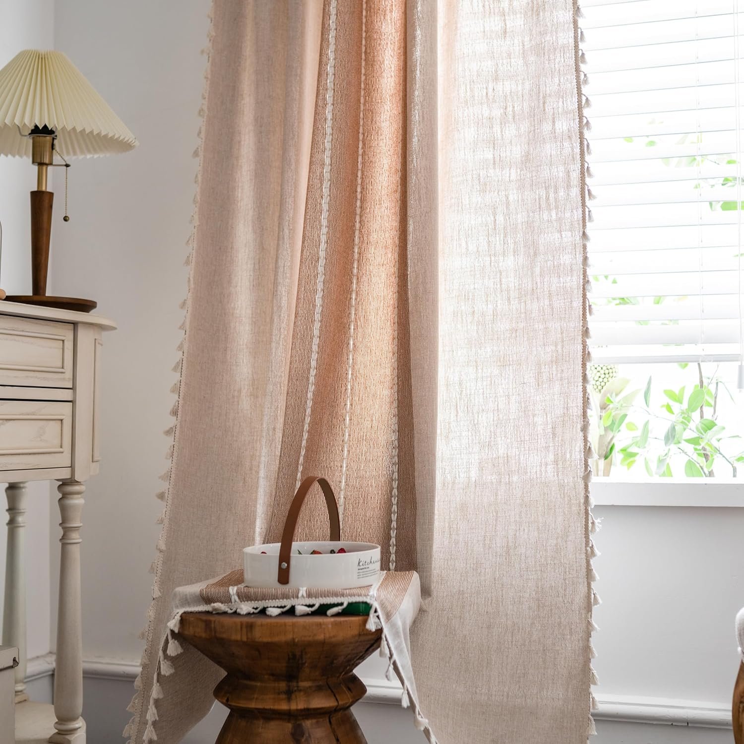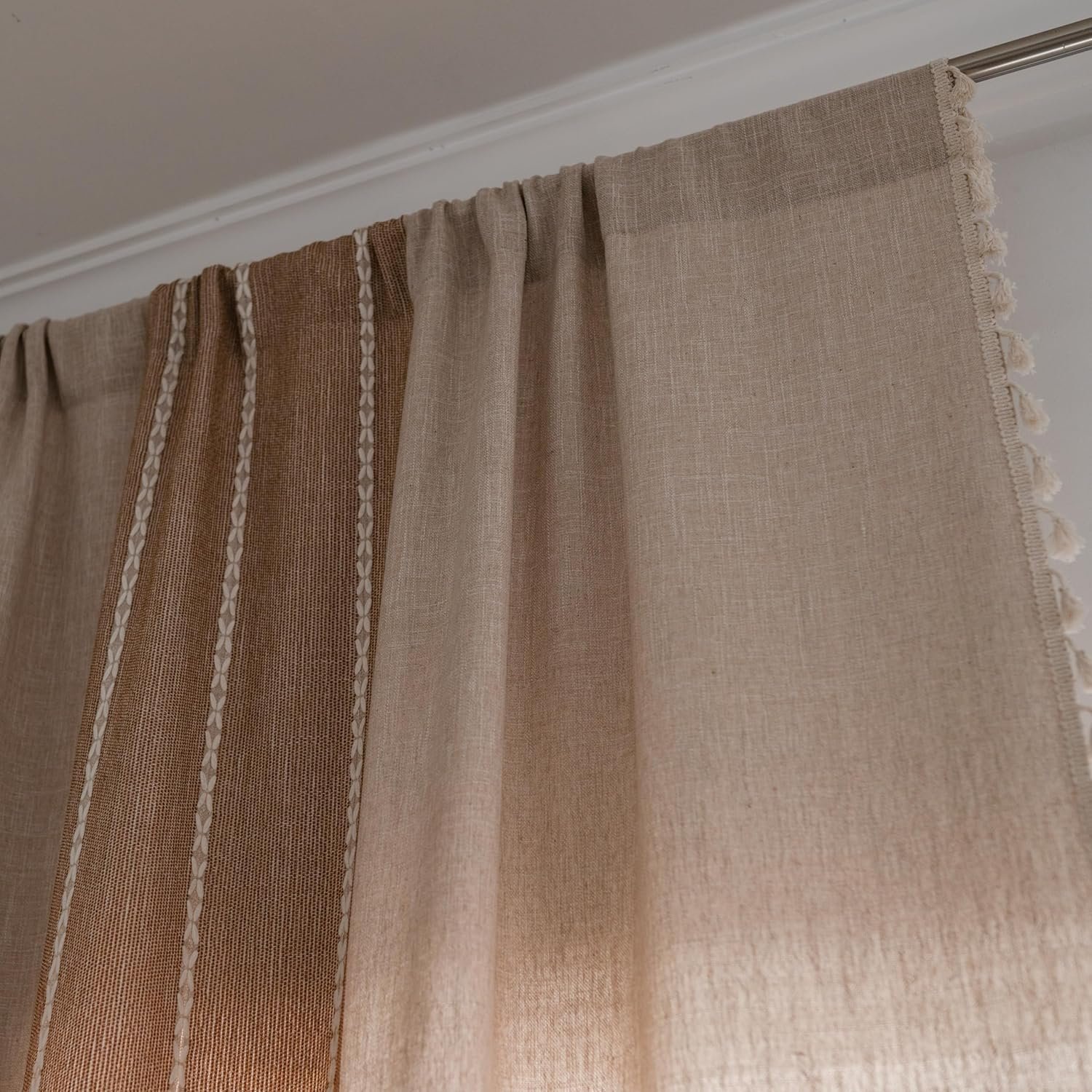 Sutuo Home Boho Curtains for Bedroom Dining Room, Semi Blackout Linen Farmhouse Shabby Chic Tassels Window Treatment Bohemian Embroidery Drape, Rod Pocket 1 Panel 52″ W x 84″ L, Coffee Linen